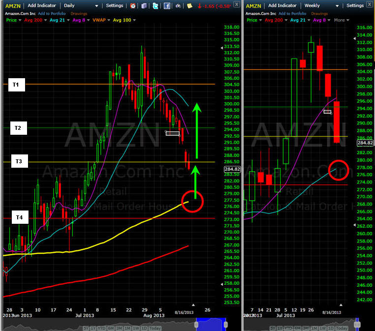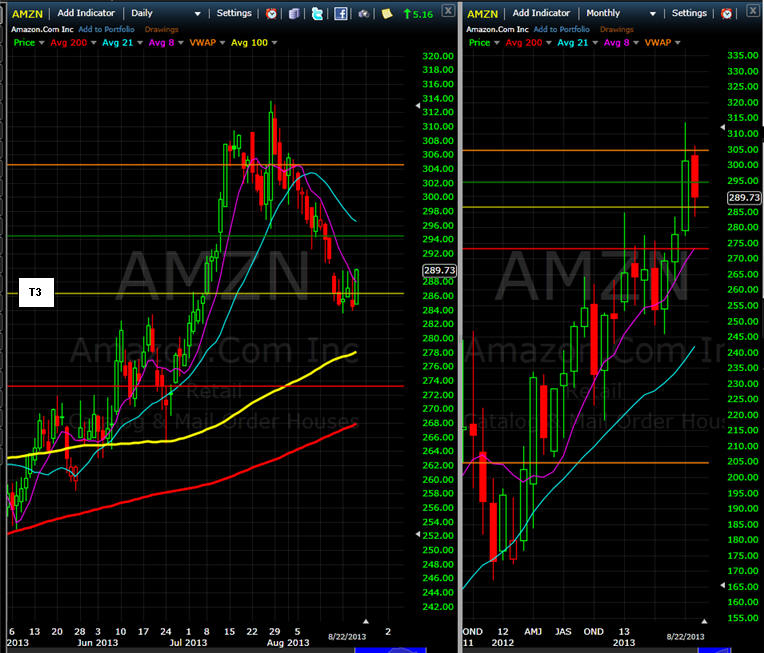 ================================================================================================================= 8/22/13 - Selling is over and AMZN bounced off T3, time to get long and stops just under T3. If you buy options, then pick up half and fish for the other half 55% below your entry prices.