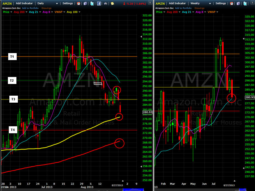 ============================================================================================================================= 8/18/13 - Nice week of selling in AMZN and with Thursday's gap down, we could still see some more downside action to the 89MA. As long as AMZN is under T3 I am waiting because the rebound should be a strong one. I am looking for the Bull 180 set up here. With news that AMZN is moving into the retail Food distribution business with Amazon Fresh. This is an ambition endeavor and they have the financial and distribution muscle to implement this. It will take a long time to build infrastructure and distribution channels. Currently it is only offered in LA, Seattle. As this rolls out and if it becomes a success, you will see AMZN price move MUCH higher over time. Not so sure this news can move it dramatically over the short term, but it can add value to the company's bottom line and drive future projections=much higher share price!