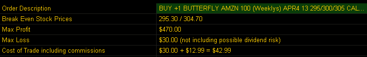 ========================================================================================= 4/25/13 - Tonight AMZN reports earnings and win or lose this stock defies logic and keeps going higher based on the future. They sell just about everything, so in the minds of investors, they will be very profitable some day over the rainbow way up high...in the future. How can you fight that kind of logic—it certainly would have Spock scratching his ears...lol. I have found this stock difficult to trade ahead of earnings because the options are more than overpriced with implied volatility, so the best (safest) bet is to sell premium on a small contract basis and then tomorrow we fish for the White Whale trade! The expected move for AMZN is: