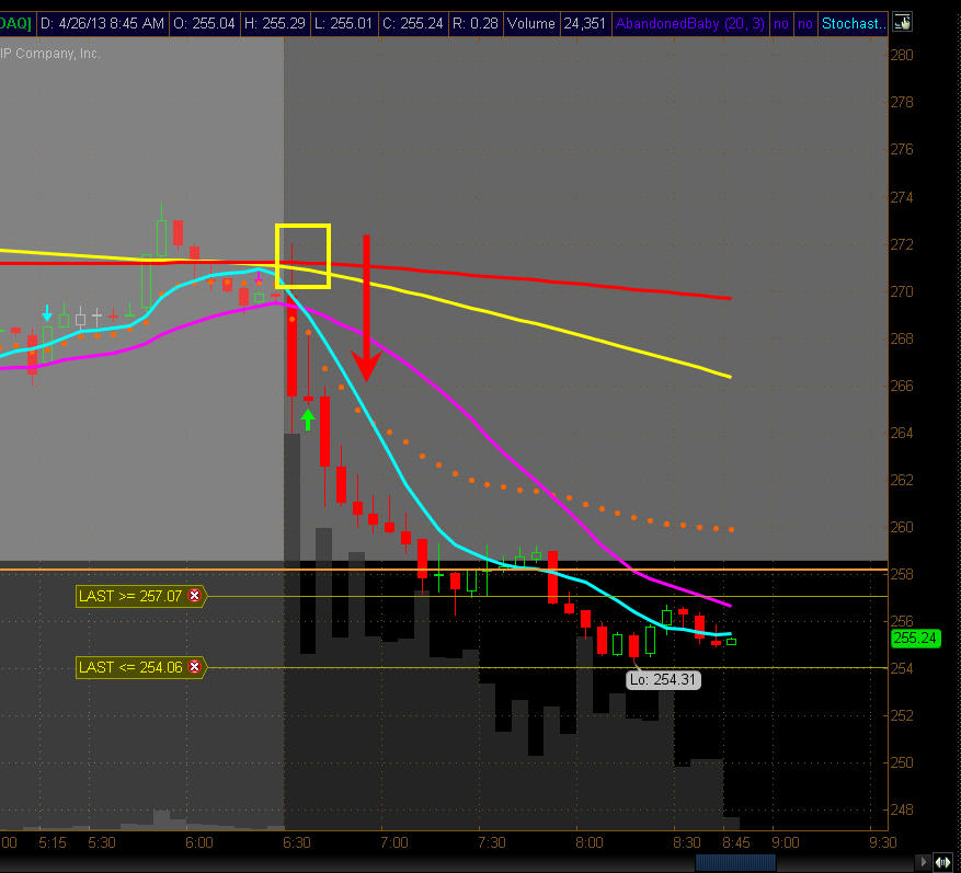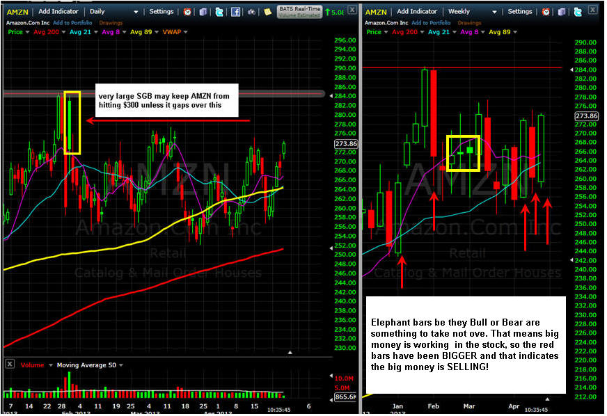 ================================================================================= 4/25/13 - AMZN Beats but sales fall short. Revenue of $16.07 billion just missed analyst views of $16.144 billion. After hours trading has another White Whale trade setting up but most likely not a strong as AAPL. In after hours trading, AMZN did run up to $290 which was well over the SGB back in late Jan but sold off hard after the conference call closing UNDER that SGB...very bearish and we could be in for a multi-day sell off especially if the markets turn too. I will be looking for a White Whale trade with my bias on the Put side. If we do start to sell off I will pick up a MayWk1 $255 Put.
