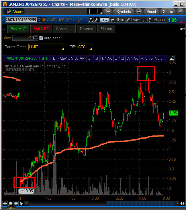 ================================================================================================================== 10/24/13 - Still losing money but stock soars in after hours on future profits...lol...what a stock eh? I know, they will be a huge success on the balance sheet some day right? All I know, is you trade what you get and right now we are looking to get a FAT PAY DAY tomorrow if it holds current price levels in after hours trading. I am ready this time to pounce tomorrow with a WW trade! Can this stock hit $400 tomorrow or will it get pumped and dumped like NFLX did? We just need it to make a move tomorrow and we get paid. Ok, so the strategy here is to buy put at the open just above today's close and if they slam the stock back down we are in line to catch a Whale! On the call side, we hope for a pull back and then short cover rally like we got with GOOG so we want to buy the $390's and $400's on the dip. If the stock does fail to gain ground in the first 15 minutes we sell some Bear Call Spreads. We know the next two months is their sales season and it's looking like they will have a boom and that is what investors are going to key in on when deciding what to do tomorrow. There was not negative events or announcements on the conference call so I do not see any reason for this stock to get crushed but anything can happen so we need to be prepared. Last quarter, I bought some puts and then calls and then I got cocky and sold the 300 naked calls when the stock began selling off. Problem was, I got the crap kicked out of me when the stock jumped back over $300 and went on a massive $15 squeeze. My plan this time is if I do sell some Naked Calls once I think the stock will not take out the post market trading highs, then I will sell the Nov Wk 1 365's to collect extra premium. I will use almost all of the value of that premium and buy as many Oct Wk 4 calls no more than two strikes higher than my Naked Calls. That way, if we get that squeeze going again, I make BANK without worrying about covering the Naked Calls until I am at a massive profit. Now if the stock crumbles, I make money on the WW puts and any other puts I buy plus the premium in the Naked Calls will collapse paying me back on the Lotto calls I bought—I will NOT be Amazoned again! Note: this is NOT a strategy for small accounts. It can still crush you so do not do it if you cannot absorb a total loss. Sell 1 - 10 Nov Wk 1 365 Naked Calls Buy as many Oct Wk 4 370 and 375 Calls as you can based on the amount of premium you take in. DO NOT spend any more than the premium you would get so you can make sure you get paid back on the OTM calls if the stock falls tomorrow.
