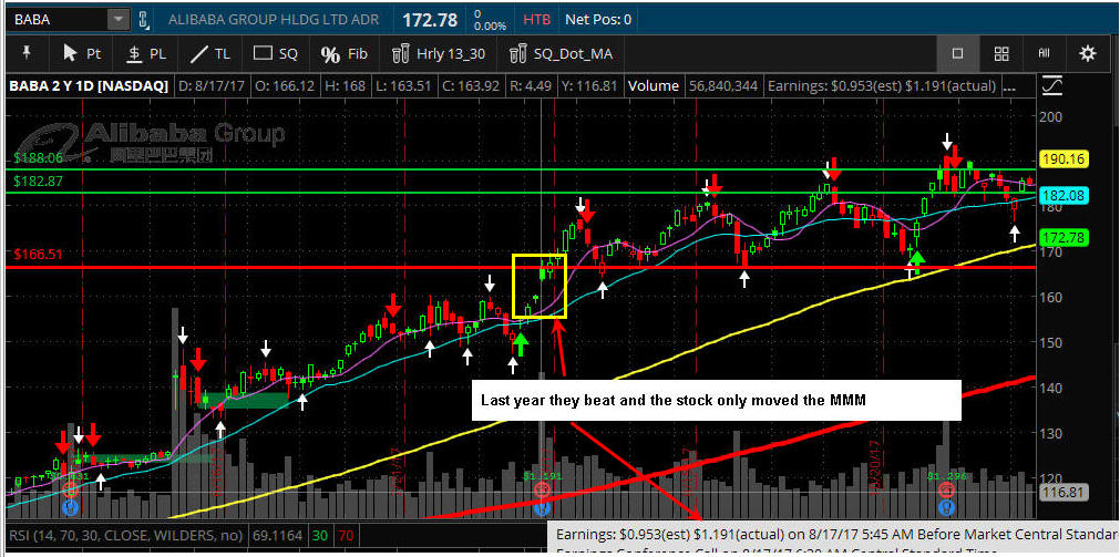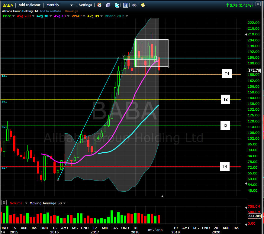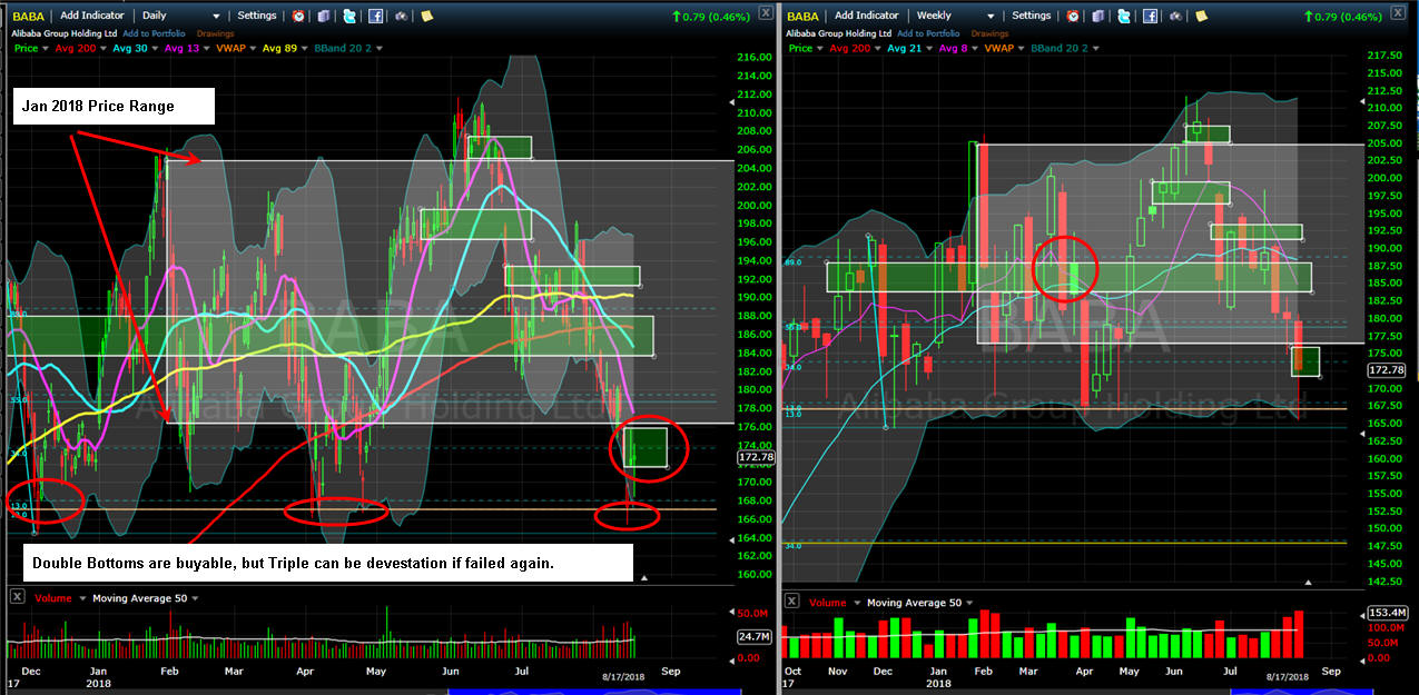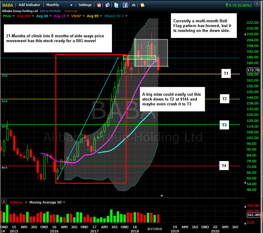 ================================================================================== 8/19/18: It has been a long time since I last commented on BABA; and this stock has had some impressive moves over the years. BABA is a difficult stock to trade because it is NOT a "real" stock like most...it is a "holding company" stock and not subjected to the same scrutiny as regular listed stocks. There is always issues with their accounting practices; which makes fund manager a wee bit cautious to commit large capital; therefore, this stock does have some wild swings from time-to-time. Also, this stock is usually hard to borrow for shorting and that also stirs up the concerns of large capital investors; and since the China trade war news hit the markets, BABA has been on a long down trend from its all time highs at $211. It is believed that China's economy is on the decline; and that will continue to put pressure on this stock if/when that proves to be the actual case. BABA is known as the Amazon of China, so if Chinese consumers have less to spend, then BABA is going to continue to suffer; and so will their stock price here in the USA. When they report earnings this week, I am sure all ears will be on their "long term" growth plans because if they are not expanding horizons into other venues, then a slowing consumer economy is devastation for the stock. If they report a surprise quarter on their core business, then we could easily see a nice pop back to the 200MA at $187.00...maybe even go higher. If they meet expectations, then its gong to be up to guidance and future endeavors that will decide this stocks reaction and fate. Last week the stock put in a triple bottom pattern at major support around $166.00; and Thursday it closed with a tombstone DOJI SGB at $172. When stocks do double bottoms, they are heavily bought, but when a triple bottom comes, it can be total devastation if it fails to hold. Now that a SGB showed up, I will be watching close for clues to direction. This is a difficult one to choose a bias on, but when you see SGB's show up at the "bottom" its typically a long bias; and when they are at "tops" its a short bias; therefore, my thinking is to go with straddle plays on spreads (Iron Condor or Credit Spreads) and do some wildcard Lotto Trades up to 15% OTM. I am thinking the bias is still DOWN, so I plan on doing PUTS for this week and CALLS or Spreads with a longer time-frame after I see the action in the next couple of days.