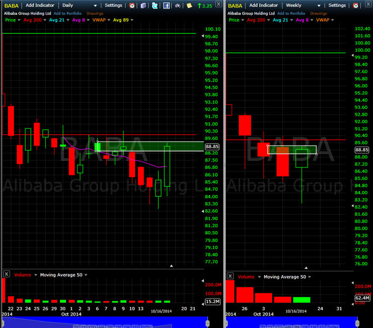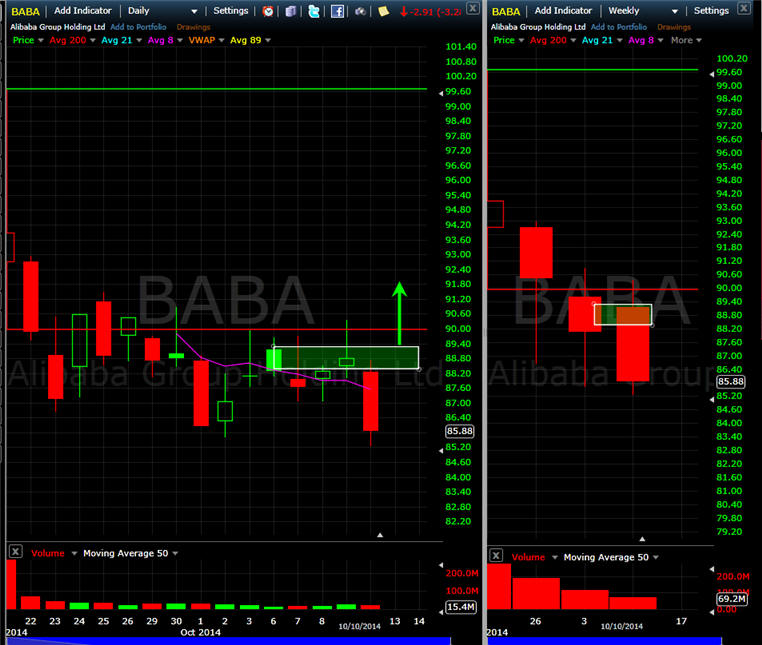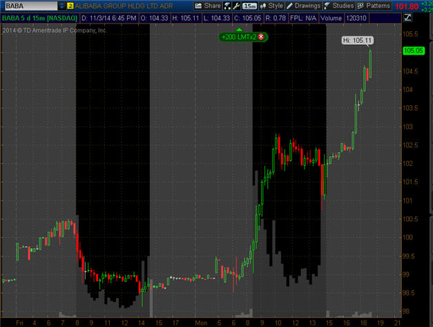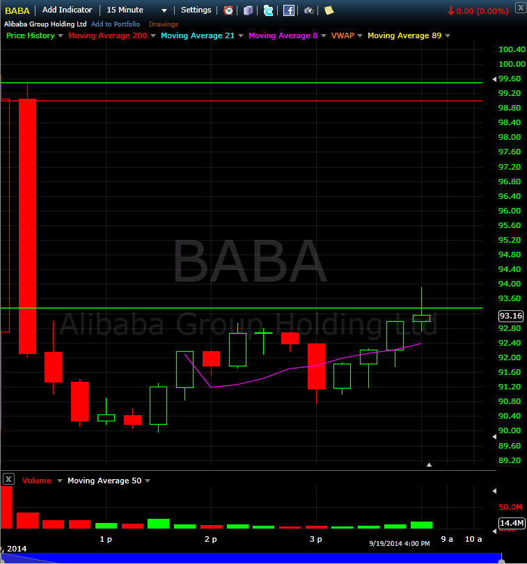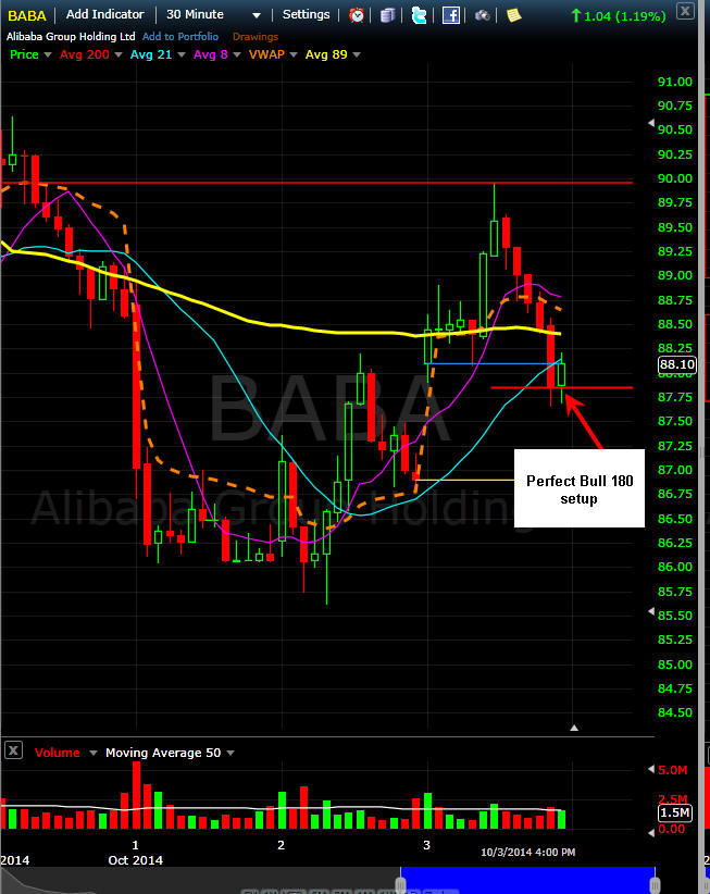 ====================================================================================================== 10/5/14: BABA tested the low of the IPO on Friday and pulled back all day but now it's a perfect Bull 180 setup on the 15 min chart. If that fails on Monday, then I will continue to hold my Bear Call Spread