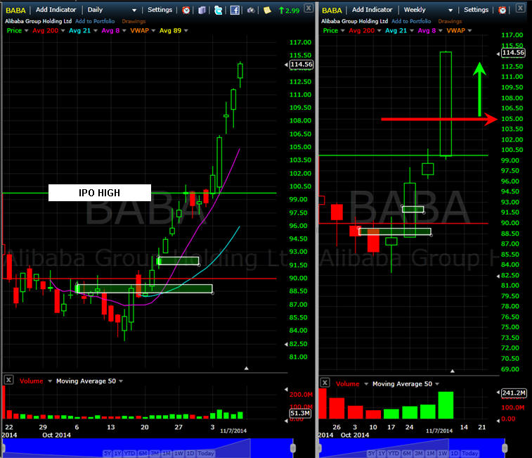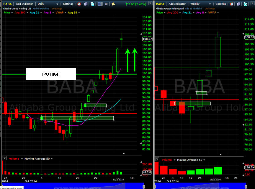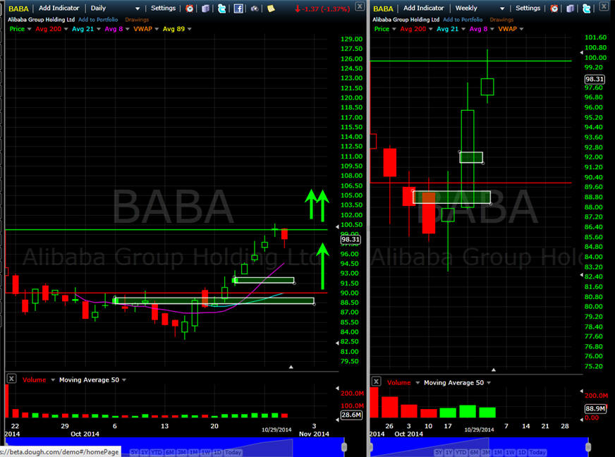 ===================================================================================================== 11/3/14: Investors hit the gas today taking BABA over $100 a share, and in after hours trading, they bid up the stock over $105.00! The company is set to report earnings before the open so if you are not already in the trades, then you have to wait for the reaction and it's going to be an explosive one if after hours is any indication. Expected MMM is +/- 6.37 but this stock is more than capable of moving over 2x that number. Of course, we will have to wait and see, but rest assured, there will be plenty of trading opportunities to come. It's highly anticipated they will report a very good first quarter and you would have to think the management would not flub this up being its the first one since going public. This is a massive GROWTH story and if they show investors they are in for the long haul, then we will see this stock among the heights of GOOGL, AAPL, AMZN etc. maybe even take out PCLN heights in the future. Investing in this stock is more of an "investment". You just need to buy shares and take the ride for the next 5+ years. As for short term trading, we will have massive profit opportunities and I plan to make well over $1 MILLION bucks trading this stock in the coming years...are you ready to make it with me? I am sure we will have a good WW trade coming soon too!