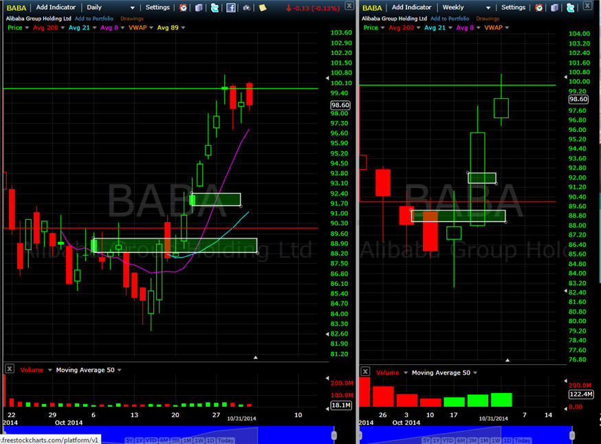============================================================================================================= 11/5/14: More new highs as BABA gets upgrades galore with price targets to $120. You always have to be a little suspect when lofty upgrades get announced right after earnings. More often than not, stocks get pumped and dumped, initially. I was trail stopped out of my NovWk1 calls today so I will be looking for another entry point with more time. If we get any pull back to the 8MA I am on it with aggressive calls.