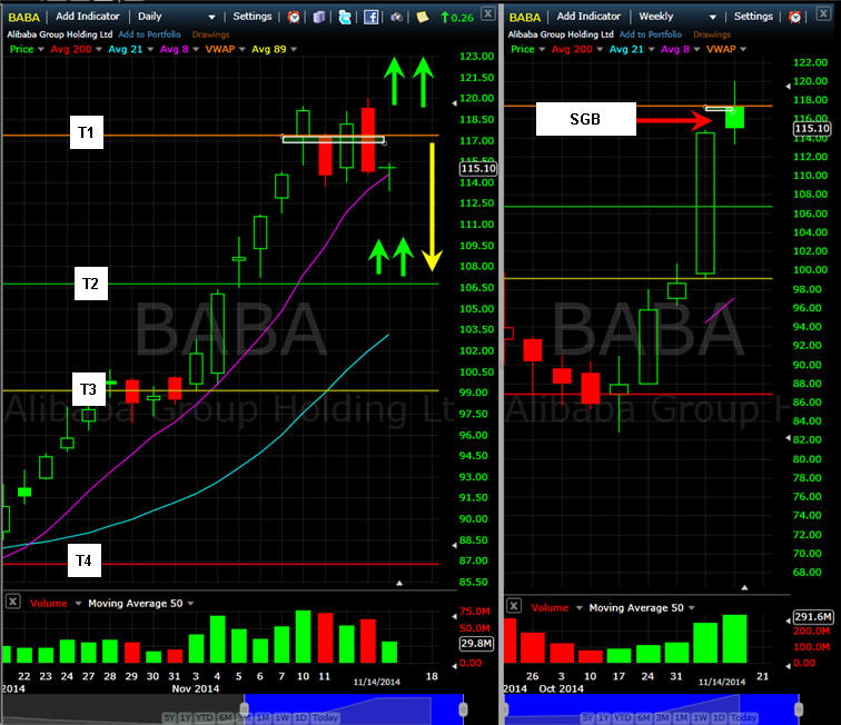 =================================================================================================================== 11/22/14: Friday produced a SGB on the daily chart but that may not matter if BABA announces deal with AAPL. This stock is either going to be the biggest company in the world some day or known as the biggest sham in IPO history. But wait, it's currently the biggest IPO in the history of the American stock exchange so how could it become a sham or grand slam? When you are presented with information on stocks to invest in, you need to always view that information with a double grain of salt—especially in this way over heated market. Stocks have been touted as good investments since the beginning and yes, if you bought (the right ones like: IBM, KO, AAPL, MSFT, NFLX, AMZN etc. ) and held for a very long time, then you eventually were rewarded with large gains, dividends and wealth. What we have with BABA is a very strong opportunity to repeat history for the long run, but it can be a tricky situation with this particular stock. Currently, everyone is enamored with CEO Jack Ma and his meteoric rise to prominence since the IPO of his company Alibaba (BABA). He has been on a media tour making all kinds of interesting comments and story telling scenarios to keep people interested. Recently, it was reported that he made a comment that his company could be the king of retail vs. AMZN. He lamented that 20 years from now AMZN may not even be in business!