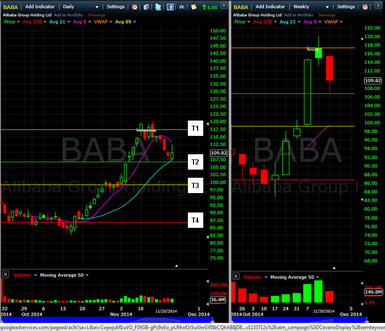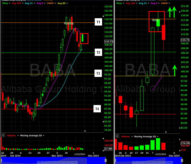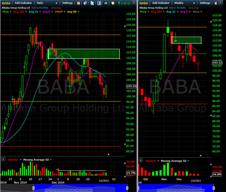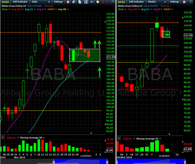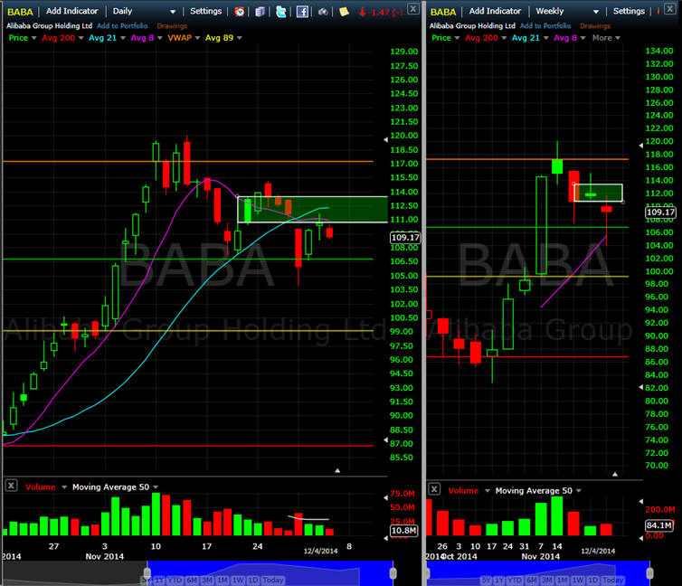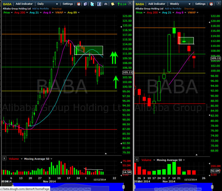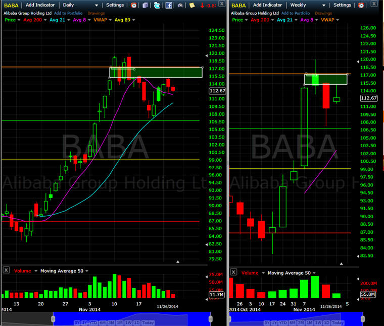 ============================================================================================================= 11/30/14: Testing the SGB and holding so far but a dip under is not an aggressive short for me with speculation they could cut a deal with AAPL. I am sticking to fishing for that news even and will continue to buy OTM calls. As long as BABA holds $110, I will add to my 120 calls. If it falls under this I will pick up some $115's.