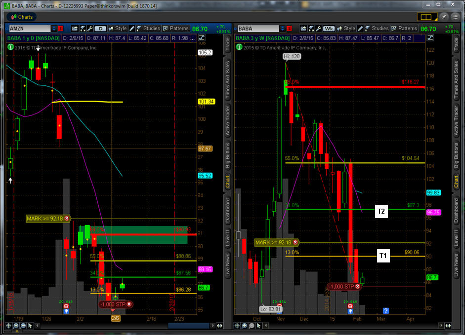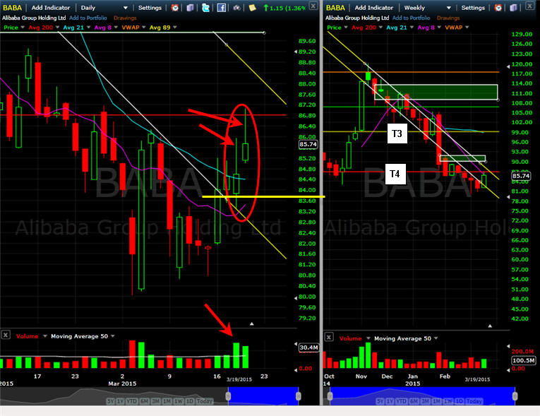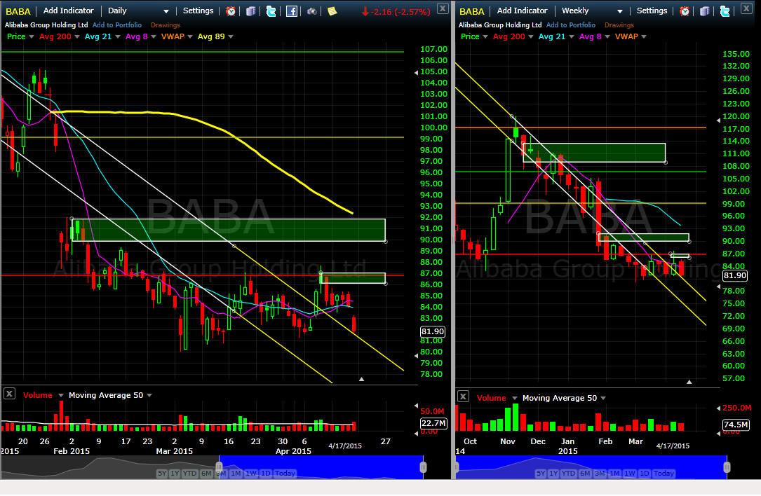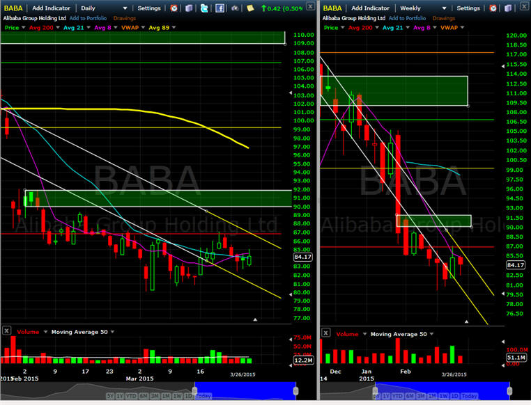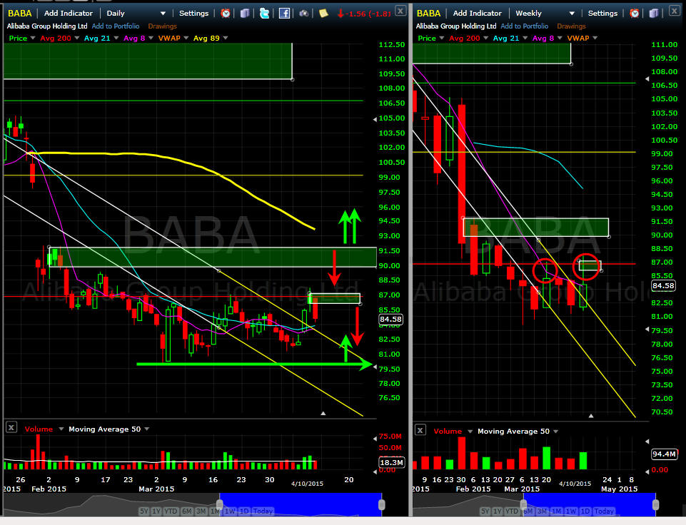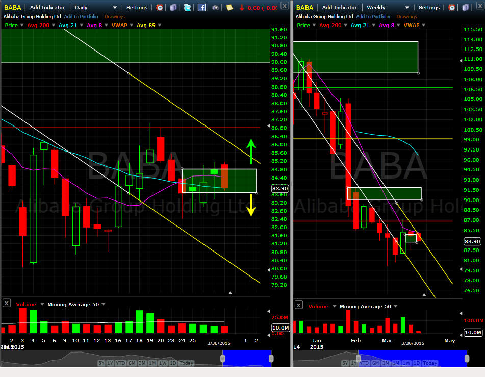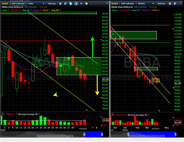 ===================================================================================================== 4/5/15: Those two SGB's are definite keeping a lid on any upside for BABA so we have a nice price point to make decision with. Above $85.21 is a long bias and under $82.80 is a short bias; however, shorts are not to be traded aggressively, so if you are not able to actively trade your positions, then fish for long entry point with limit orders.