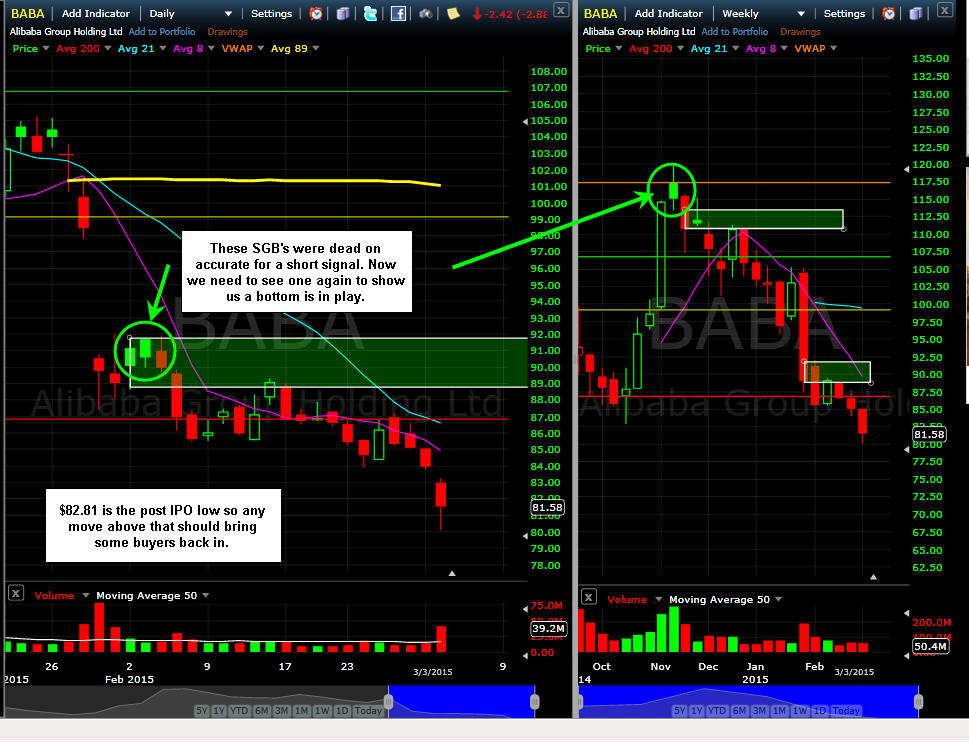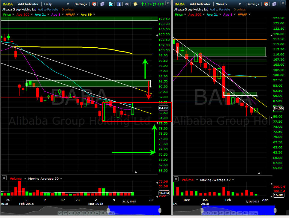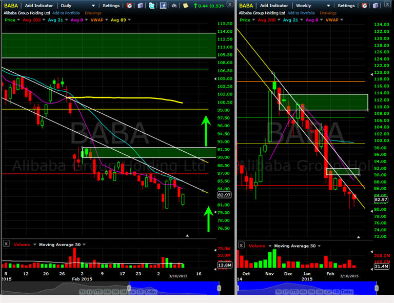 ====================================================================================================================== 3/10/15: If BABA holds ground here in the face of a continued market sell off, that will prove to be a very bullish opportunity so I plan to keep fishing for some call plays with small size. Until the stock can get back over the SGB zone at $90, I am not getting aggressive. The lock up is coming on Thursday, so I do not see BABA making any big moves higher. In fact, I am hoping for a blowout drop under $75 so I can get more shares to hold onto.