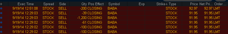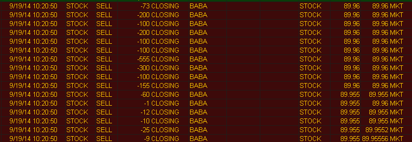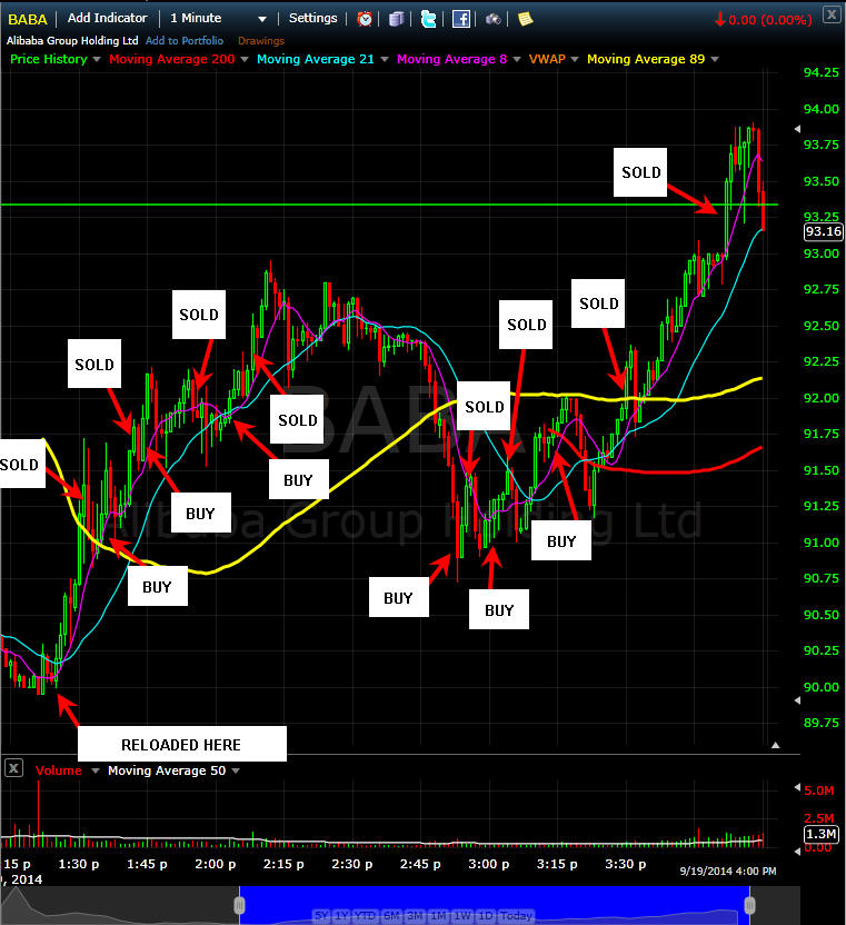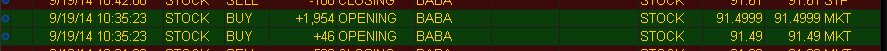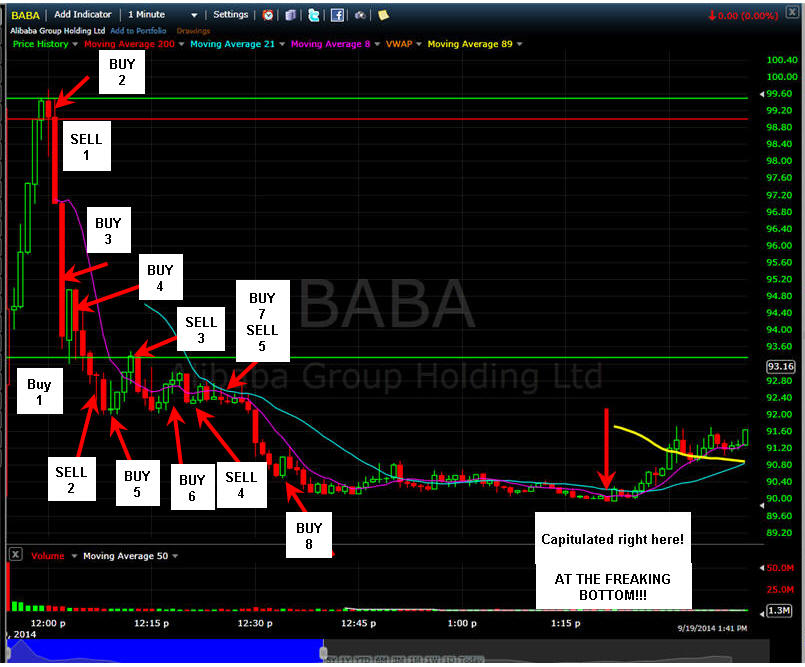 ==================================================================================================================== 9/21/14: The biggest IPO in history was handled professionally and orderly. I was watching the entire even unfold on CNBC and learned a few things about how the IPO process works. It was some of the best content I have seen on CNBC in a very long time. Once trading opened up, the stock short up rapidly and it looked strong for BABA to take out $100, but that was not the case—the big money was not there with buy orders...they were selling that benchmark price. I managed to catch some shares at the open selling my first round at $98.99; however, even though that was a good trade, it was only 100 shares so I was not that satisfied because I was trying to get 1000 shares and could not get filled on my initial order. Ok, so guess what I did...lol...I sold my 100 shares near the top and then when I thought it was about to bust out over $100, I bought in again, but this time, I pulled the trigger on 1,000 shares! Of course, I was one of the suckers to buy that top; and so I did what all professional IDIOTS do, I doubled down baby when the stock pulled back a couple of bucks! As you can guess, that was just the second level for the dumb money (ME) to get in as more accelerated selling continued. Now guess what happened next? Yup, you probably guessed it, I capitulated at the EXACT BOTTOM!!!!!