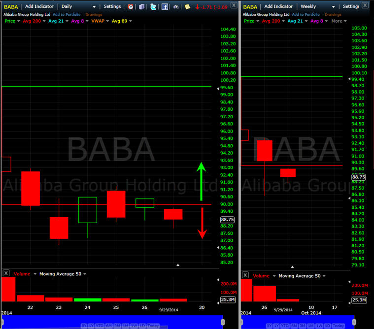 ===================================================================================================== 9/28/14: This week BABA starts trading options so expect a lot of volatility in the first couple of days. I am sure spreads will be wide and IV pumped in, so if you plan on getting in on the action, be sure to fish for entry points because the market makers will be very busy attempting to sucker in as much IV as possible. There will not be any weekly options for the time being, so that means they have a lot more opportunity to manipulate the price movements. There is simply not enough chart data to predict anything, but I will be on the lookout for SGB's which I think will be the reverse effect in the beginning—that is to say, if we do get the SGB, I would look for long plays. The MM's have front month options priced out to 135/130 and I do not expect the stock to rally that high, so I plan on selling some 135 Bear Call Spreads at the open and also some 70/75 Bull Put Spreads if there is enough premium. If BABA does make a run, it will definitely test $100 so I am going to speculate on some Lotto calls. My plan is to buy one at the open, then fish for lower prices later in the trading day if we get them.