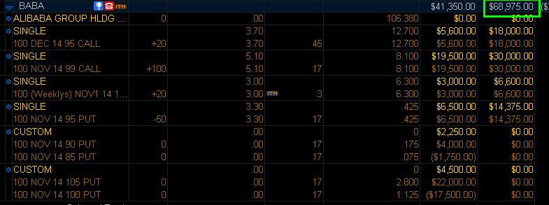 ================================================================================================================== 11/9/14: Impressive rallies post earnings takes BABA to the limits of new heights. Now that earnings season is over, investors are looking for value and growth stores to put money to work and BABA is definitely a TOP PICK on the growth front. This stock is a longer term investment and every dip that does not have a SGB involved is a buy opportunity. I suspect there will be a SGB soon, so we will have a pivot point to trade form if/when that does present itself. It's no doubt in my mind the Bear Call Spread will expire at a full loss, but I more than made up for it with the shares, calls and Bull Put Spreads. Now I will be looking for more opportunities to sell premium and speculate on longs going forward. If you want to buy calls then FISH for lower entry prices and be patient because there will be continued volatility in this stock for some time and you do not want to be the sucker to always chasing losses.