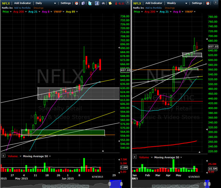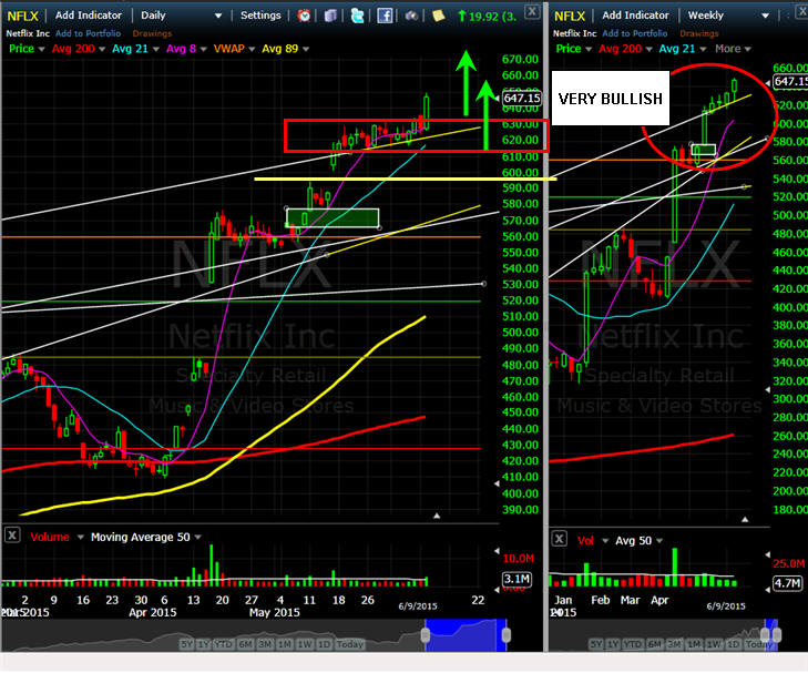 6/28/15 - We are finishing up June trading and getting ready for earnings season. The coming split in NFLX now has mixed emotions for investors since Carl Icahn announced he was SELLING all of his shares. What really stinks, is the company announced a split way BEFORE earnings—which are not going to be released until July 20th!—what the heck?@#!? Had they done it after earnings, we could have seen a massive pay day and now we get SQUAT!!