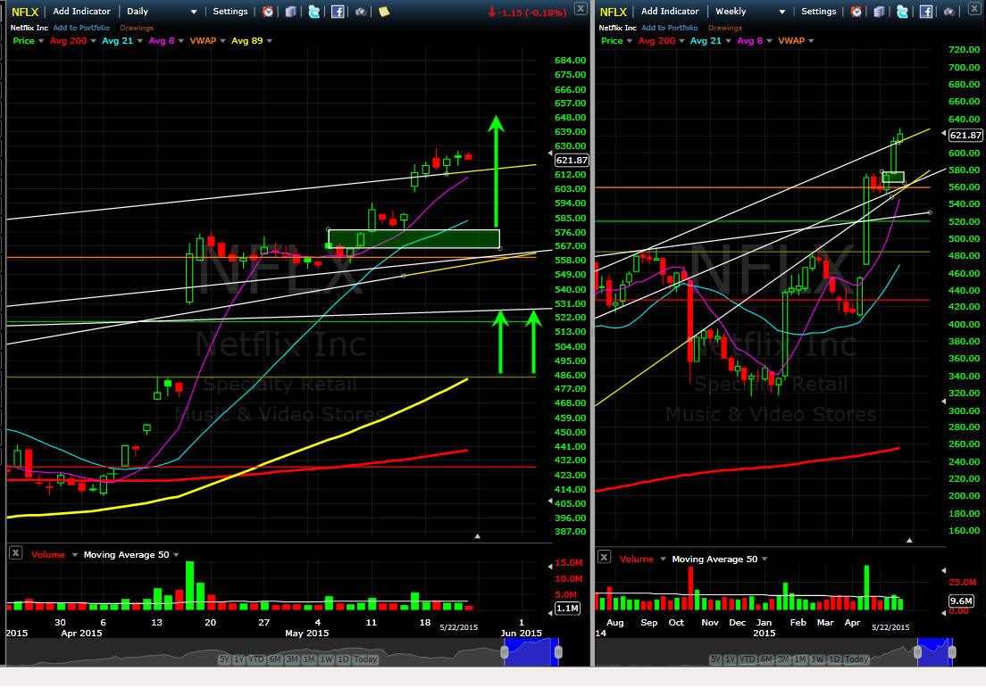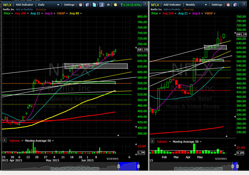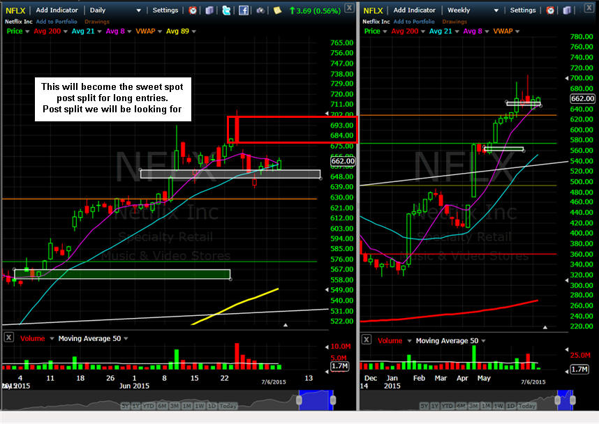 7/6/15 - The Icahn departure has played out and NFLX is showing signs of a potential split run but how much higher will it go? I think the upside is limited until post split because millions of small investors will most likely be waiting until then to get in. It psychologically fits better to buy 100 shares for around $10k than buying only 10 shares now even though you get basically the same result. This stock has more reason to pull back now than go up but over time, it will play out. The big question is will it move like it has in the past? There is no doubt in my mind that NFLX is going to continue to grow and expand content, especially now that they will have huge quantities of shares to leverage into buyouts and acquisitions etc. For now there is really not great trade opportunities on the long side because IV is pumped up at 65% so selling some premium could be a good opportunity; however, selling premium into a split is not a good idea for many reason. I am going to wait it out on any size until post split.