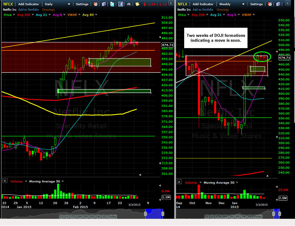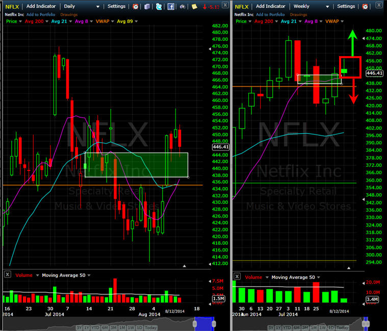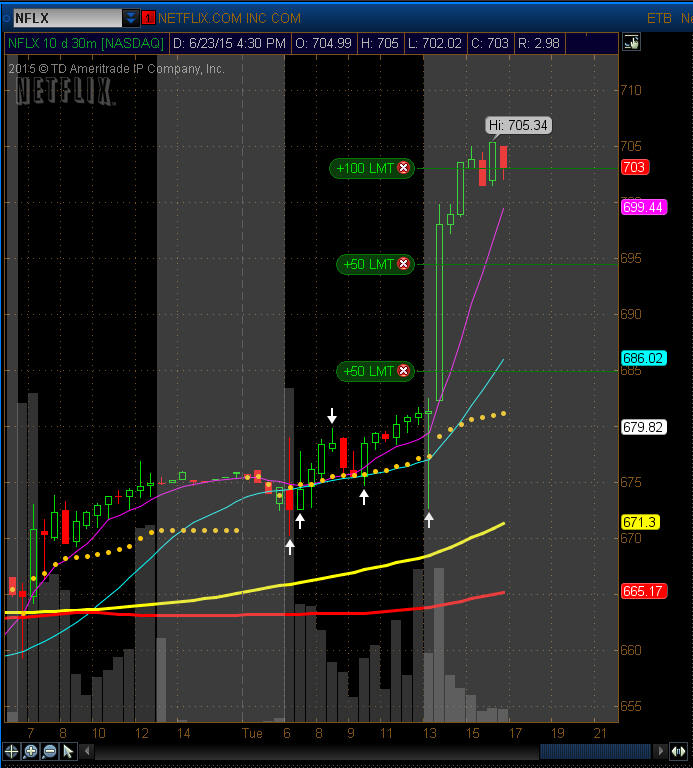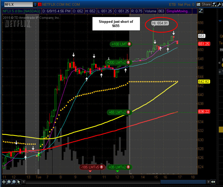 8/30/15 - There was a news article today stating the NFLX is letting its contract with Epix lapse in September which means some premium content will no longer be available. This will most likely negatively impact the stock in the short term; however, there may be an even BETTER announcement coming so you can't stick to aggressive shorts, just scalp some profits here and there but keep long calls in play all the time.