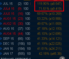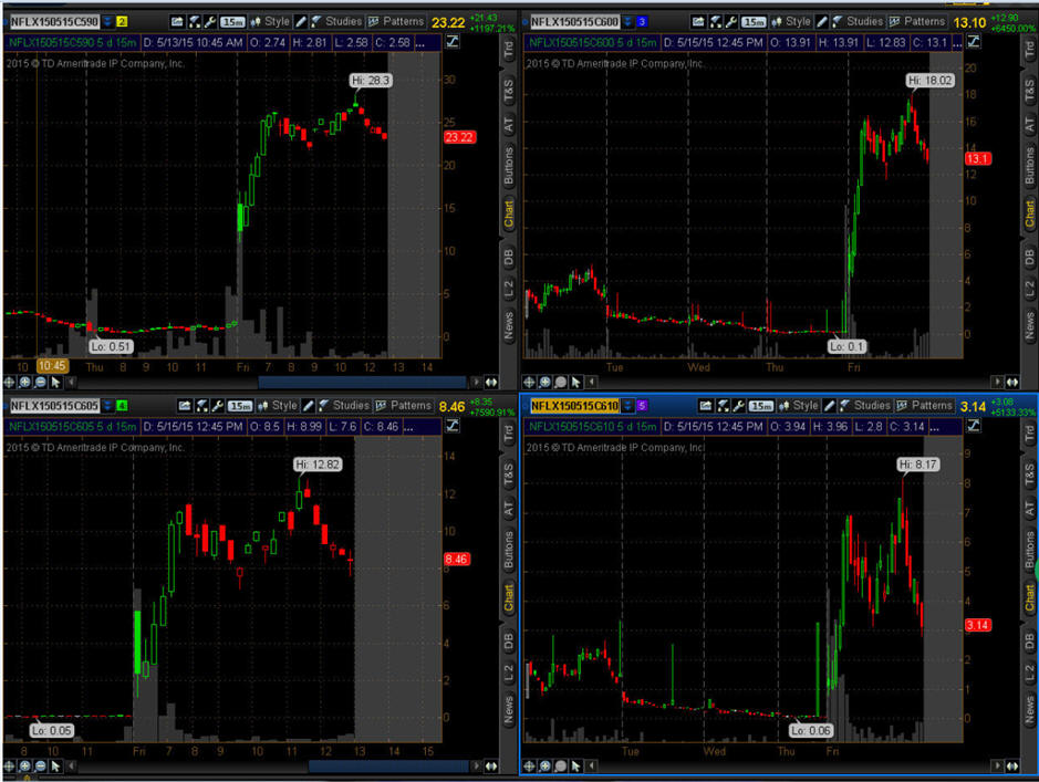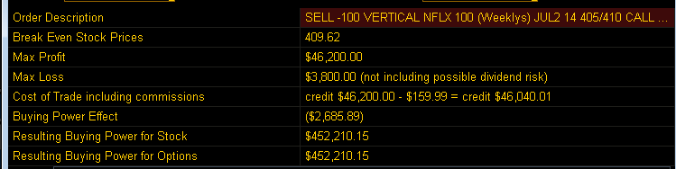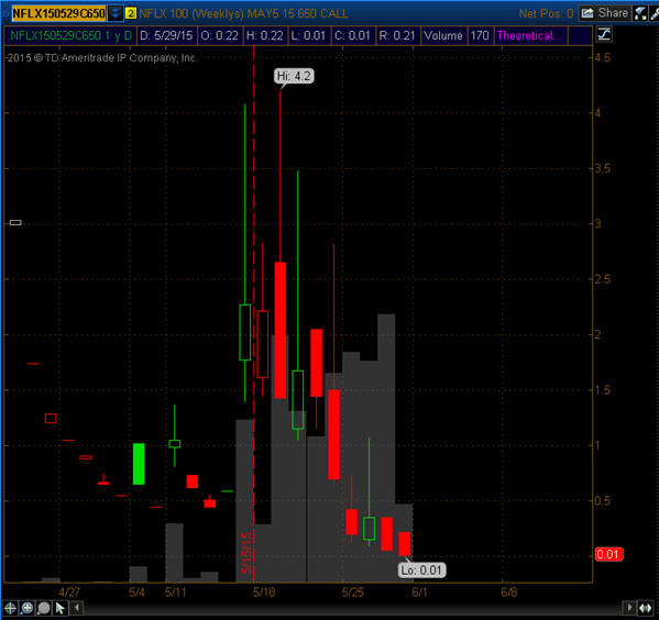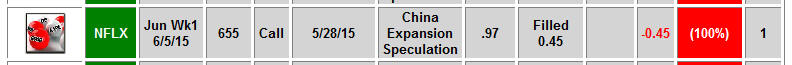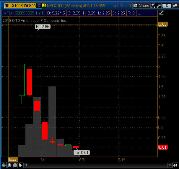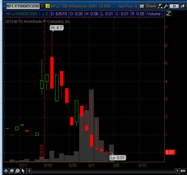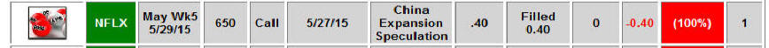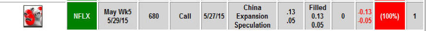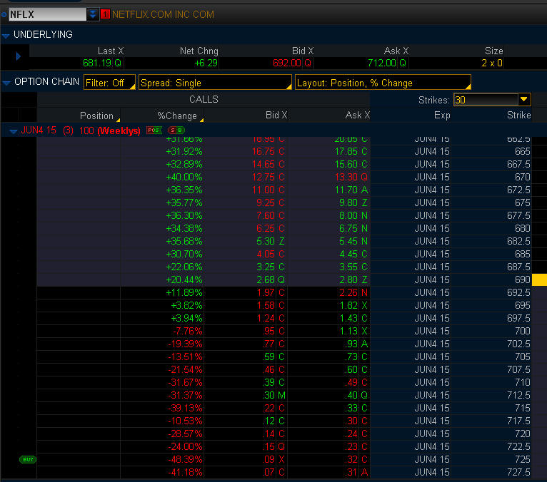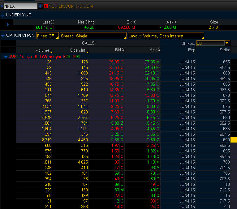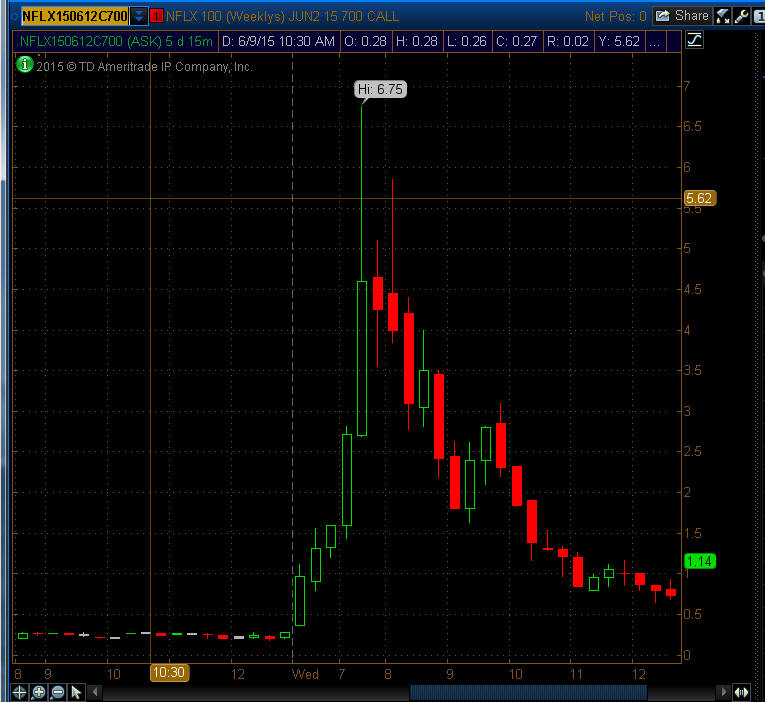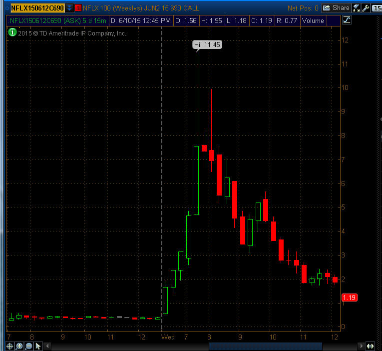============================================================================================================ 7/13/15 - Nice rally today in NFLX ahead of tomorrow's 7:1 split and now the options are packed with 99%IV so its a really bad bet to get long calls. Even with today's big rally, the options across the board rose a paltry 25-40% so the game plan here is to sell OTM premium spreads. We definitely got filled on our puts, but no way on the calls. After the impressive rally at the open, the stock pulled back all day and I am expecting it to attempt a peg at $700 tomorrow for the split, but anything can happen when it comes to stocks like NFLX; and with the stock at all time highs, popularity and tons of future compelling news, investors could very well just keep piling in looking for that split action. NOTE: if you have a large account you can sell Naked Calls but you need to go DOTM to be sure you have a lot of protection so I am selling the 800 strike that expires this week but be warned, NFLX could make some huge announcement and may just explode higher.