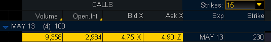 Ok, so what is the trade? Vegas baby! That is what you are doing at this point. If you want to get on this bullet train. Friday is May Options Expiration and with the markets in full BULL monde, I suspect NFLX should continue to power higher this week. So, if you want to get in this move, then you need to fish for a better price. I am jumping on the May 13 250's tomorrow if NFLX give me a chance to, and if NFLX pulls back in the morning session, I want to fish for a cheaper price on the 230's.