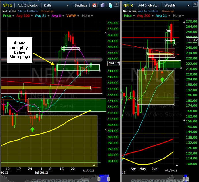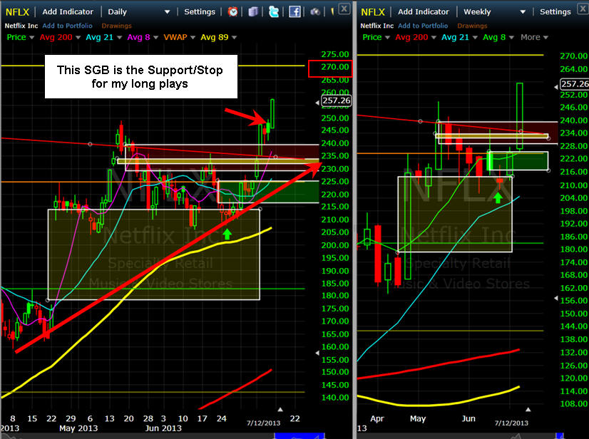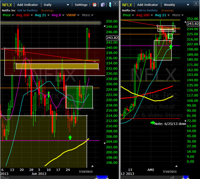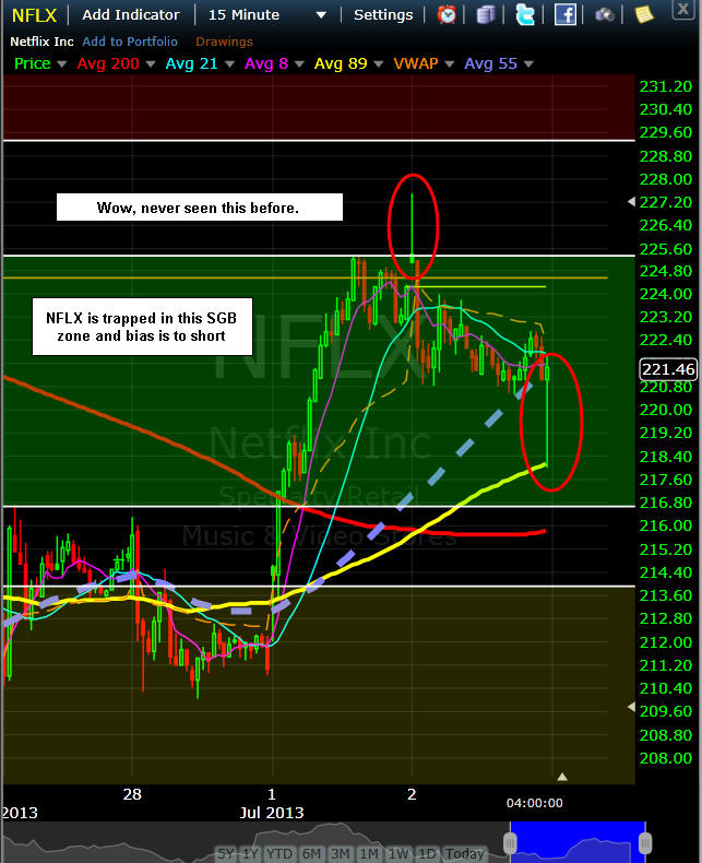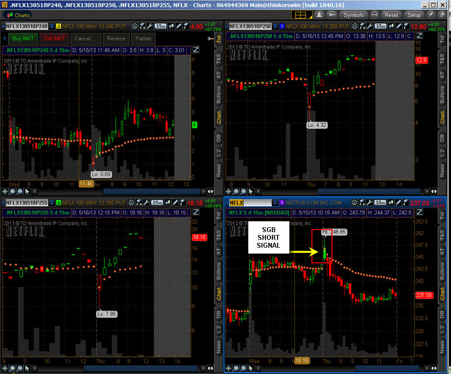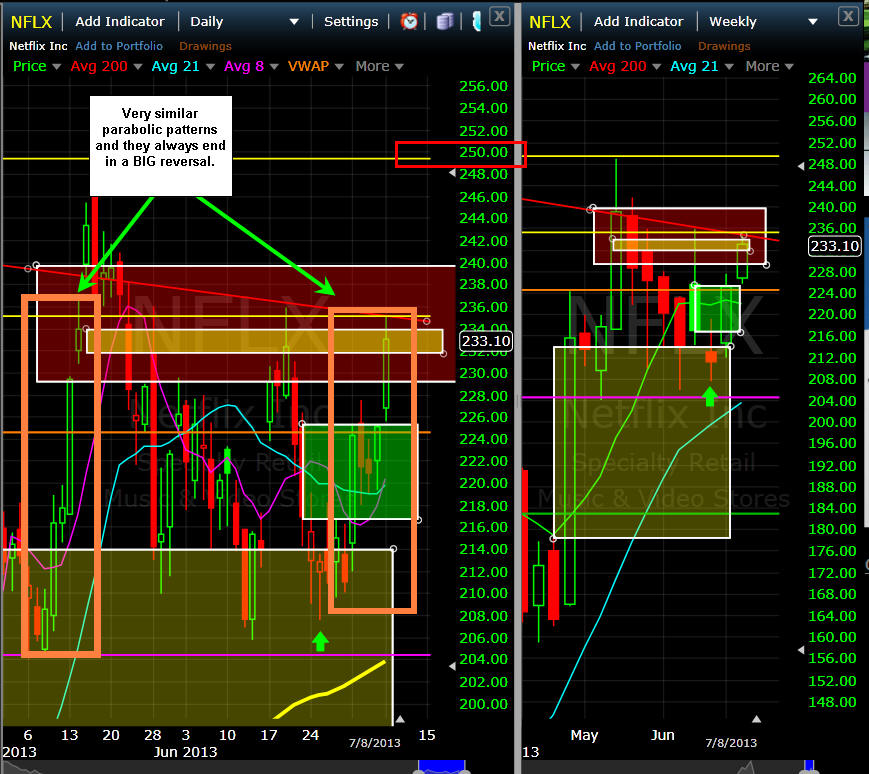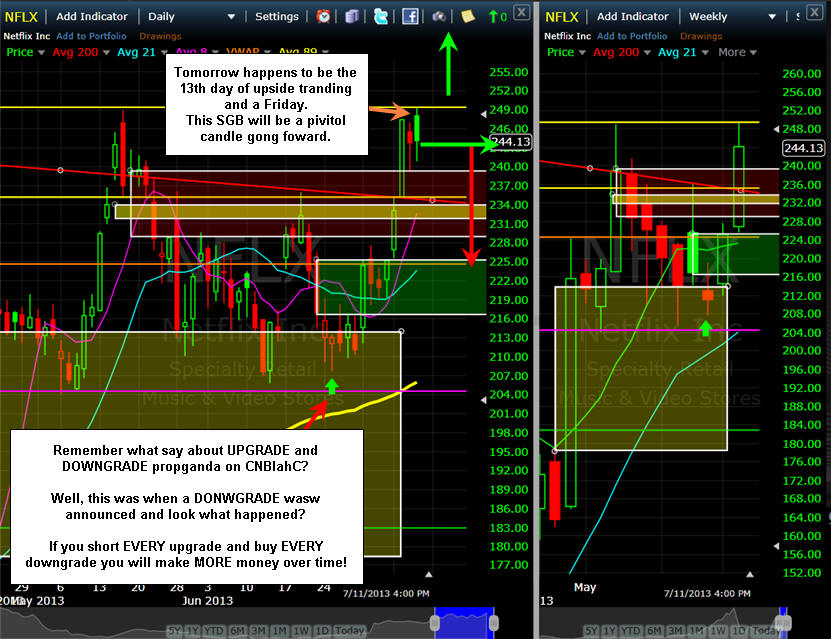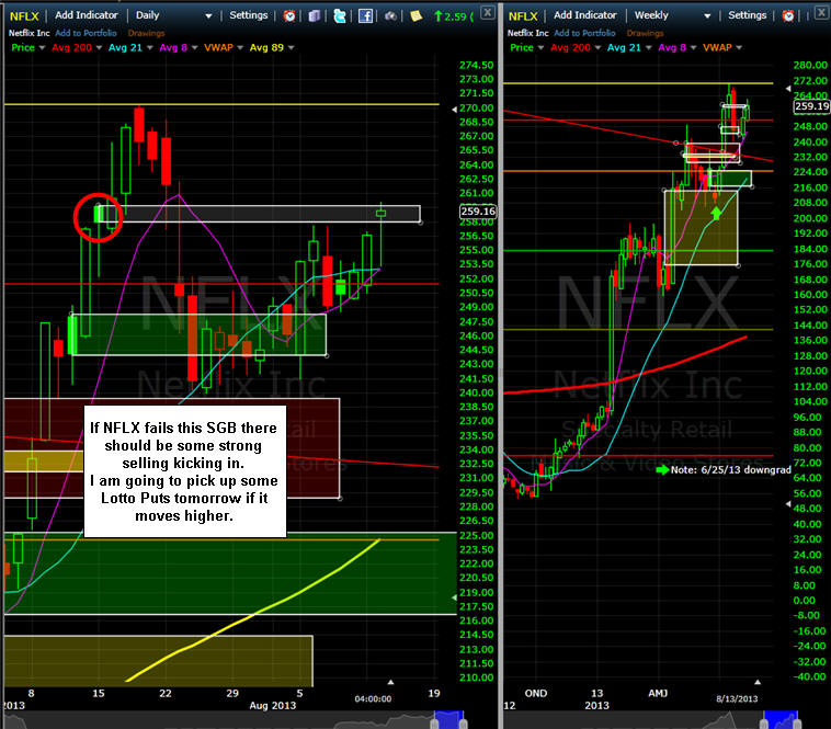 ========================================================================================= 5/16/13 - The BEARISH ENGULFING candle developed today as NFLX failed to take out $250. Tomorrow is going to be an interesting day for the markets and NFLX should move around a bit too. The 15 minute chart gave us the Short Signal SGB candle and with the failure to take out $250 and it was time to JUMP ON. I bought the 240's banking a nice profit today. I also got filled on my Butterfly positions ====================================================================================== 5/15/13 - Another gap and jump higher, This is becoming a blow off top setup so get ready for some profit taking when it gets to $250.00 - $255.00. I am fishing for some White Whale puts tomorrow if NFLX moves higher at the open. If it moves down immediately, then I will sell a Bear Call Spread.
