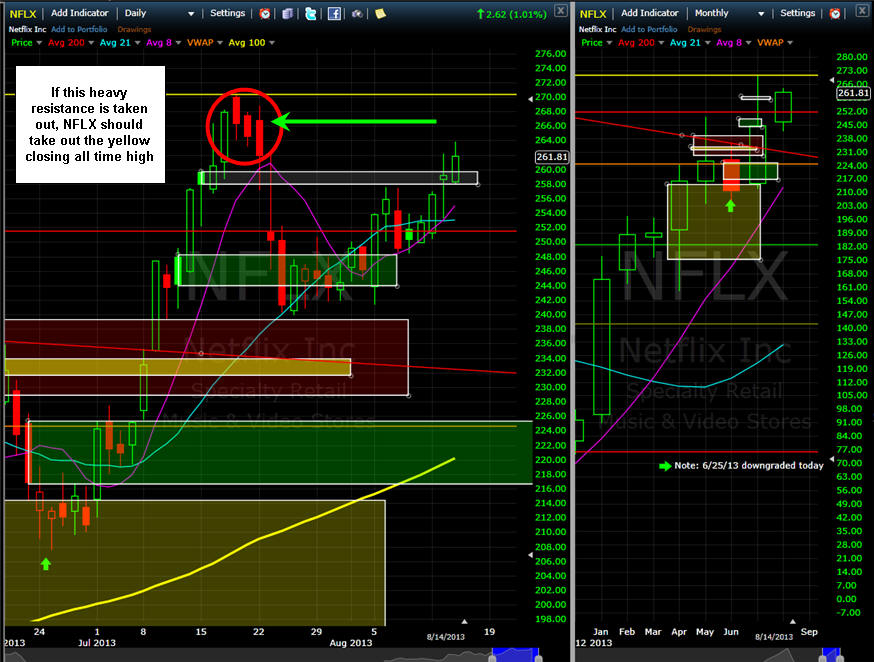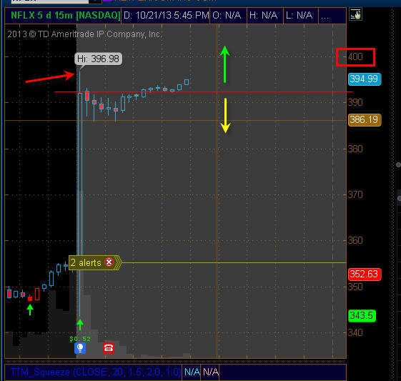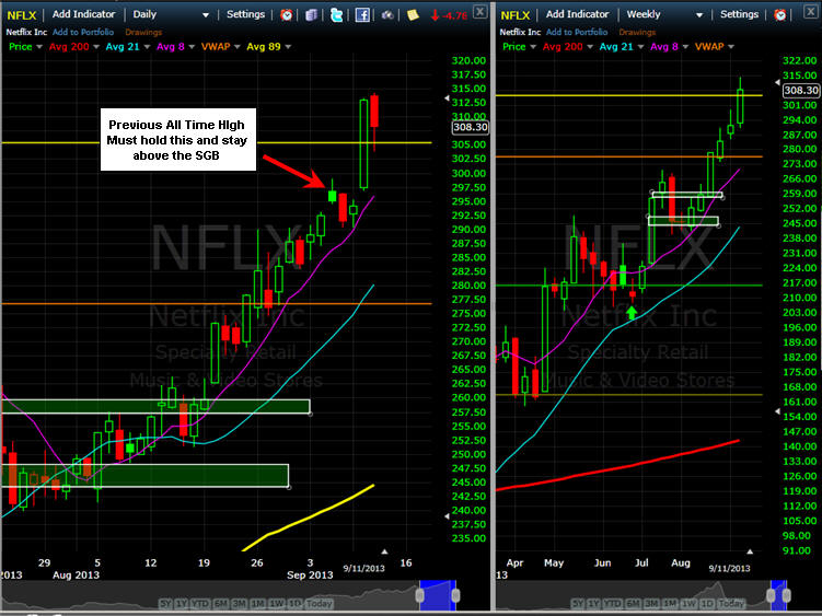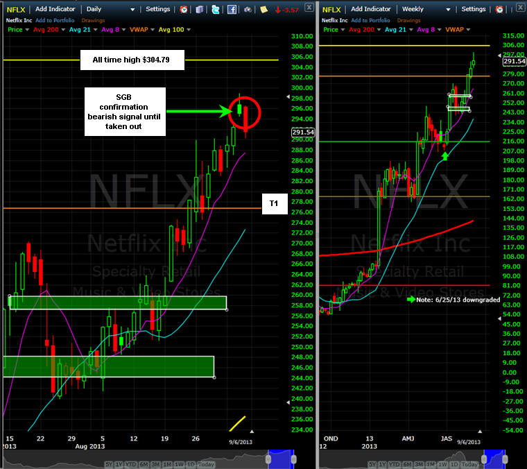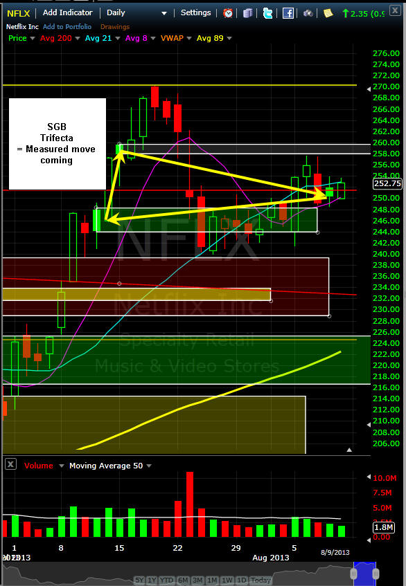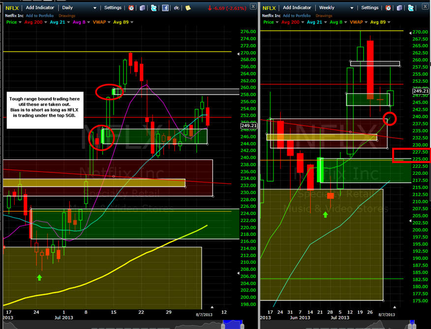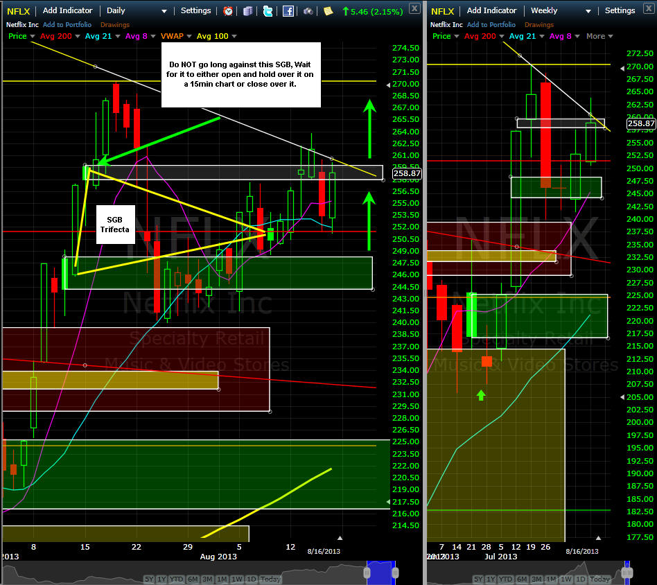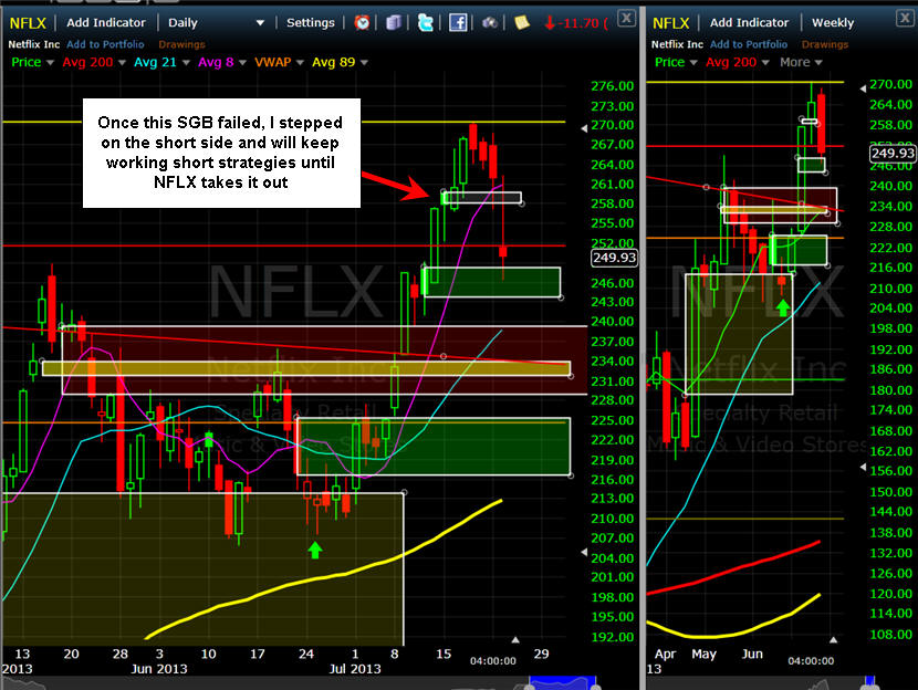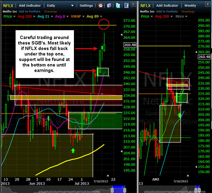 ========================================================================================= 5/16/13 - The BEARISH ENGULFING candle developed today as NFLX failed to take out $250. Tomorrow is going to be an interesting day for the markets and NFLX should move around a bit too. The 15 minute chart gave us the Short Signal SGB candle and with the failure to take out $250 and it was time to JUMP ON. I bought the 240's banking a nice profit today. I also got filled on my Butterfly positions ====================================================================================== 5/15/13 - Another gap and jump higher, This is becoming a blow off top setup so get ready for some profit taking when it gets to $250.00 - $255.00. I am fishing for some White Whale puts tomorrow if NFLX moves higher at the open. If it moves down immediately, then I will sell a Bear Call Spread.