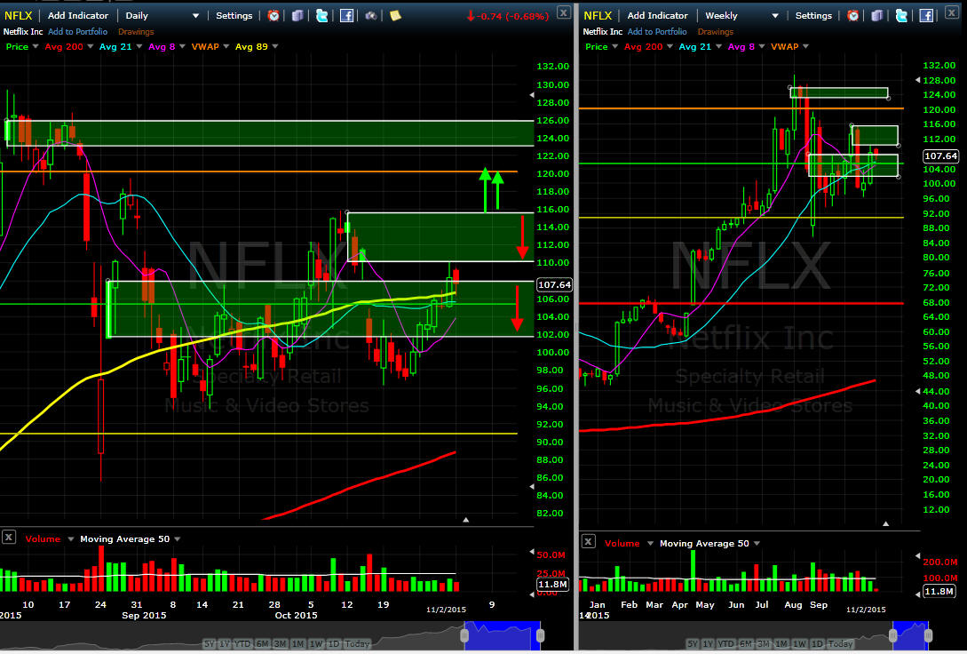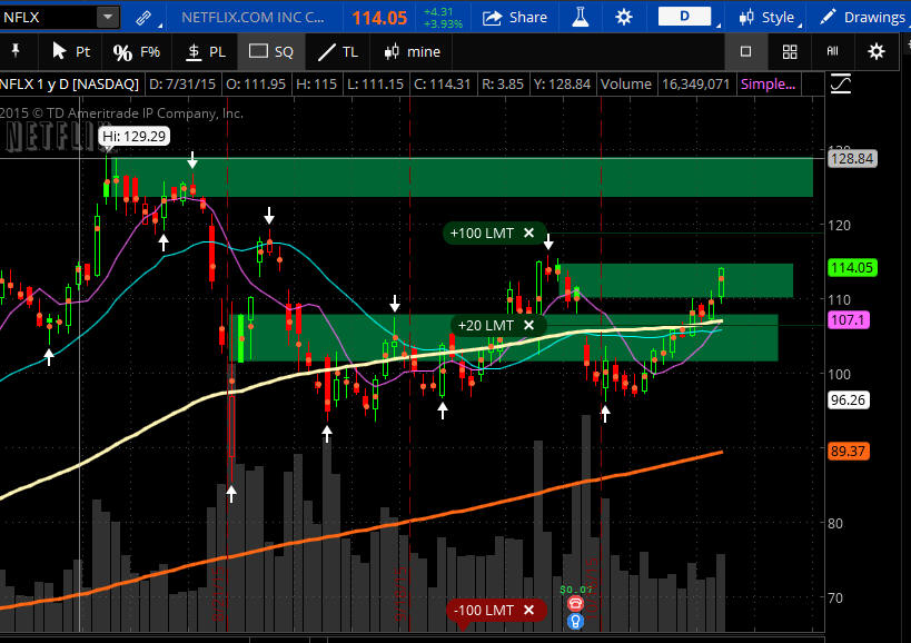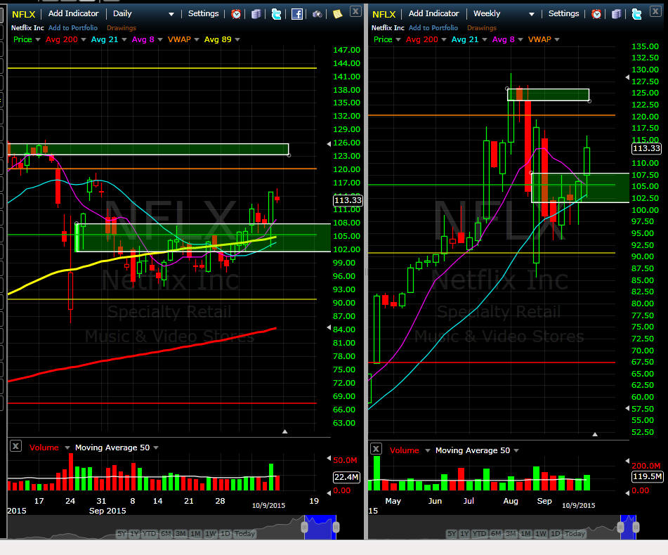 ========================================================================================================================= 10/4/15 - Markets rally and NFLX participates but not a big move compared to others. There is still some caution in investors minds but as earnings start and news comes out, I am sure NFLX will be a nice runner once it can clear out the current SGB zone it is trading in. I am looking for a move over $108 to get aggressive on the long plays and any dips back to $100 I will shop for some more long plays. I am long term bullish on this stock for now and will continue to keep Lotto calls 10% OTM every week.