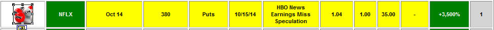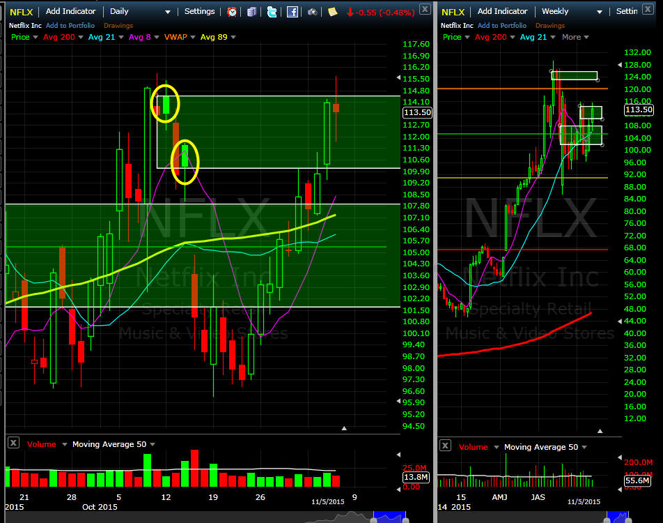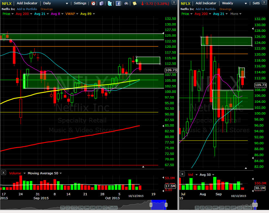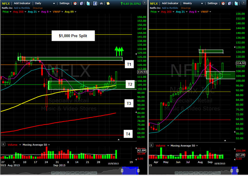 =========================================================================================================== 10/8/15 - Well, NFLX was on the way back into the SGB zone today and then they announced in afternoon trading they are raising prices again on the DVD service for new subscribers. The stock EXPLODED higher and never looked back taking options higher in a White Whale fashion. If you were on your game today, then you should have picked up on it and made some huge gains. In after hours the rise continued with closing trades at $116.35. It's looking good for a big move again tomorrow as the news gets out so I am looking to sell some BPS spreads because the Calls are now pumped up with huge IV. If you do jump on calls, then you need to be sure to take profits tomorrow on your trades because the MM will no doubt be looking to pick pockets all over the place with huge spreads and IV moves. Earnings are next Wednesday so we may very well see NFLX blast off to new all time highs over $127.00. Remember, this stock just split 7:1 so unadjusted it is actually trading at $804.00 per share and if they do beat, the the rise in prices will only FUEL this rocket taking it to $1,000.00 or $142.85. If they miss, I think the raising of prices will keep the downside capped because I am sure there will be NO backlash from customers. We also have huge content deals in the works and 2016 is going to be the release of Disney content plus more will be coming for sure.