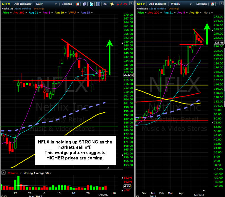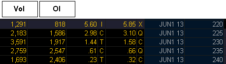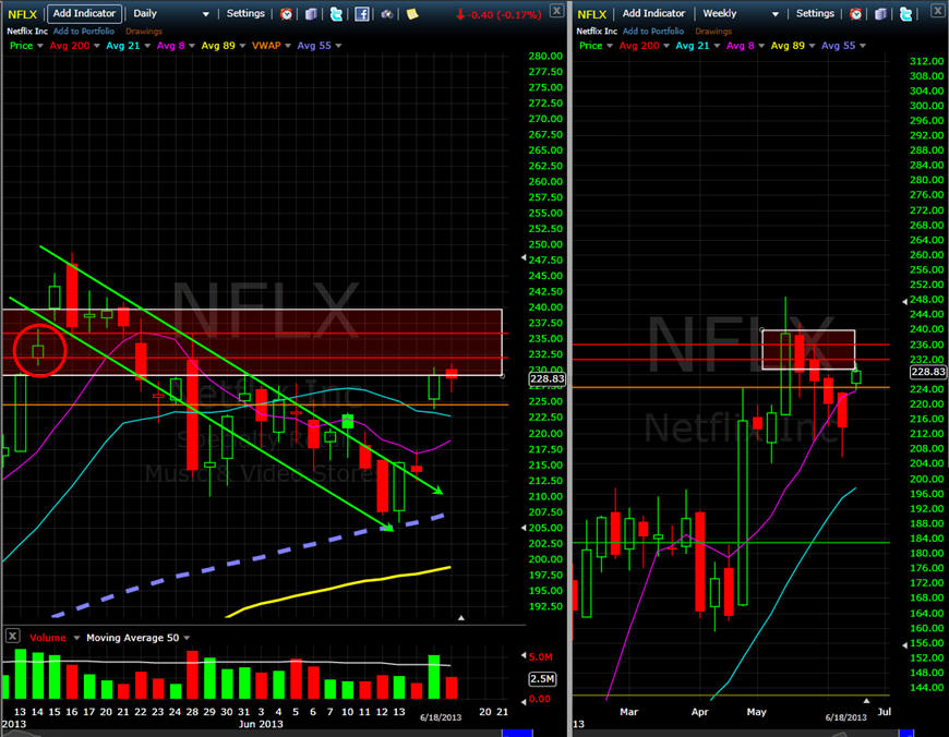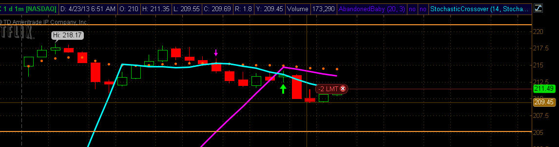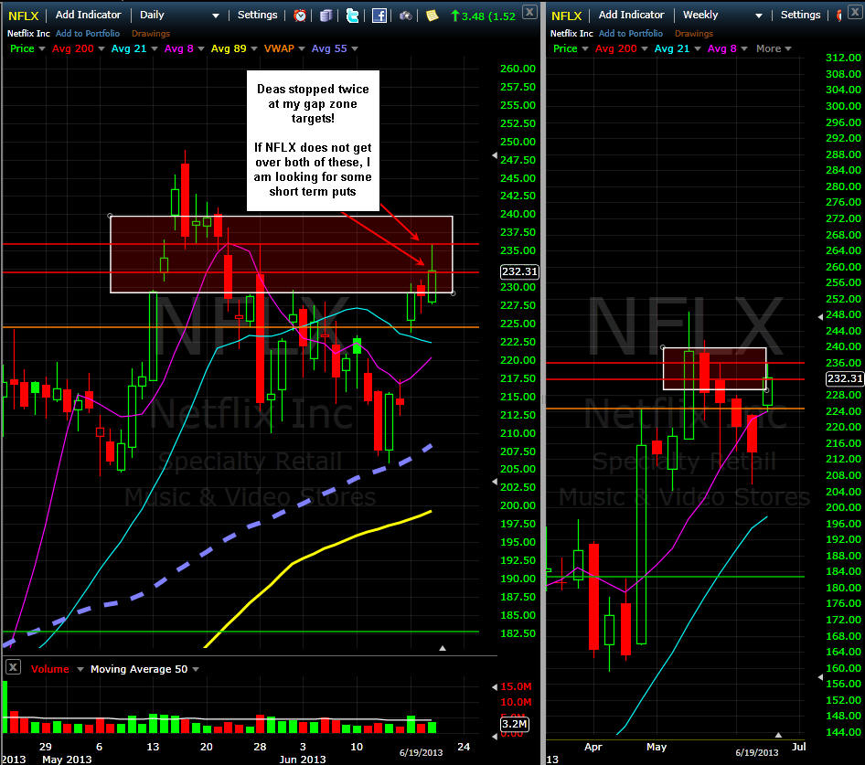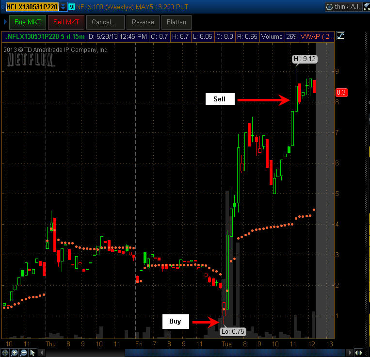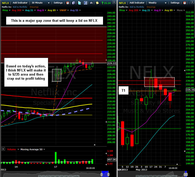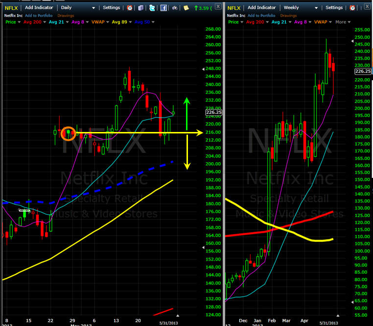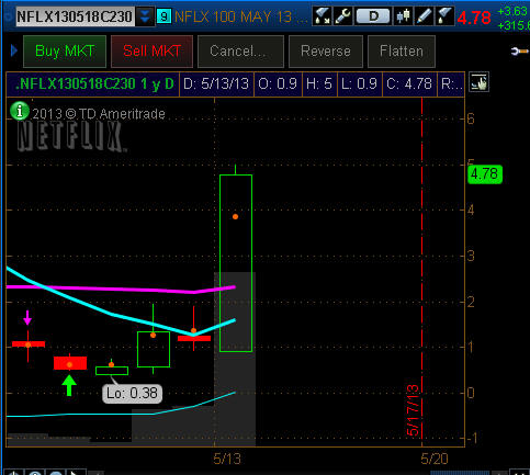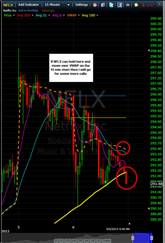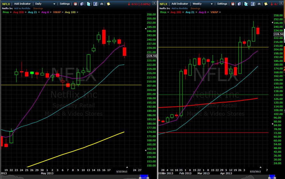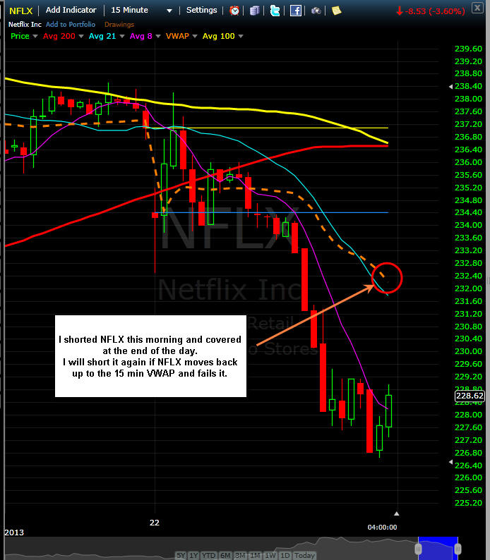 5/23/13 - A nice gap down this morning and I took my profits on the rest of my $225.00 puts for $4.00. I am still waiting for NFLX to gap up and fail VWAP on a 15 minute chart before I short the stock.