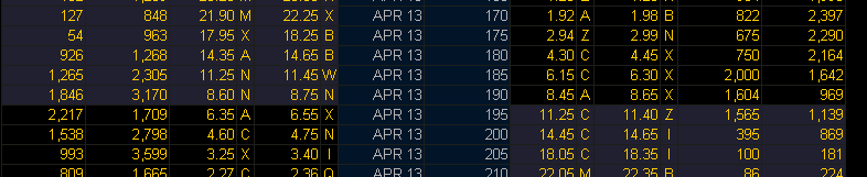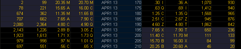 ========================================================================= 3/27/13 - What happened? NFLX should have taken out $200 today off the news stories that hit, but nooooo there was a pesky SELLER. Hmmm, could it be Icahn is exiting with his massive profit? Well, if you look over the weekly chart you can see there is definitely a seller because NFLX will not trade over $198. Typically, once a seller clears out, a stock will drive higher, but with NFLX already being up 100% this year, I suspect it may retreat until earnings are released. With tomorrow being the final trading day of the week and quarter, NFLX was definitely hit with portfolio reshuffling. So how do we figure out where this stock is headed next? Well, the best way I do that is looking over option volume and open interest. Today the MarWk5 195 calls traded a whopping 15,213 contracts while the puts only traded 3k - 8k Looking further into the future, there was a large amount of the Apr 185 Puts and 2200 195 calls. It looks like there are still more bulls interested than bears in the future.