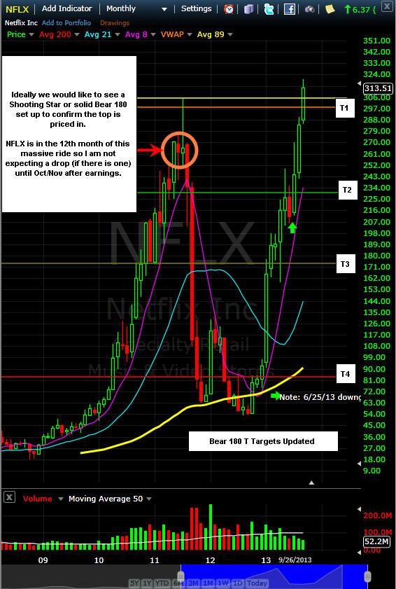 ==================================================================================== 4/9/13 - The Bull 180 is on! Stop at $165.00 with a trailing stop at $1.00. I am looking for the stock to move up to the 21MA on the daily chart. If this B180 fails, I see NFLX testing the 21MA on the weekly chart around $145.00 which is where I am now looking to start accumulating some May puts and will add more as the stock moves up or down. If this current Bull 180 Call fails, I will jump on some weekly $160 puts. Earnings are coming 4/22/13 and if they miss we could see a nice drop. I will have some puts in place as well as calls for the straddle play because I anticipate NFLX will move enough to make either side profitable.