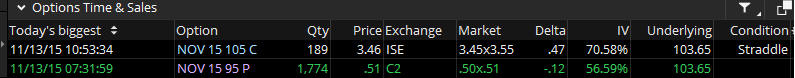 7/15/15 8:50AM - Now that the stock has split, the confusion is probably very high and with earnings coming out tonight, how much more can this stock move up or down is the big question. So far, it's sticking around at $100 a share and most likely will the entire day so if you are not already in any trades, then I would be looking to buy MORE time. I am beginning to suspect there will not be a very big move and so my OTM BCS are most likely going to expire worthless with 100% of the premium collected.