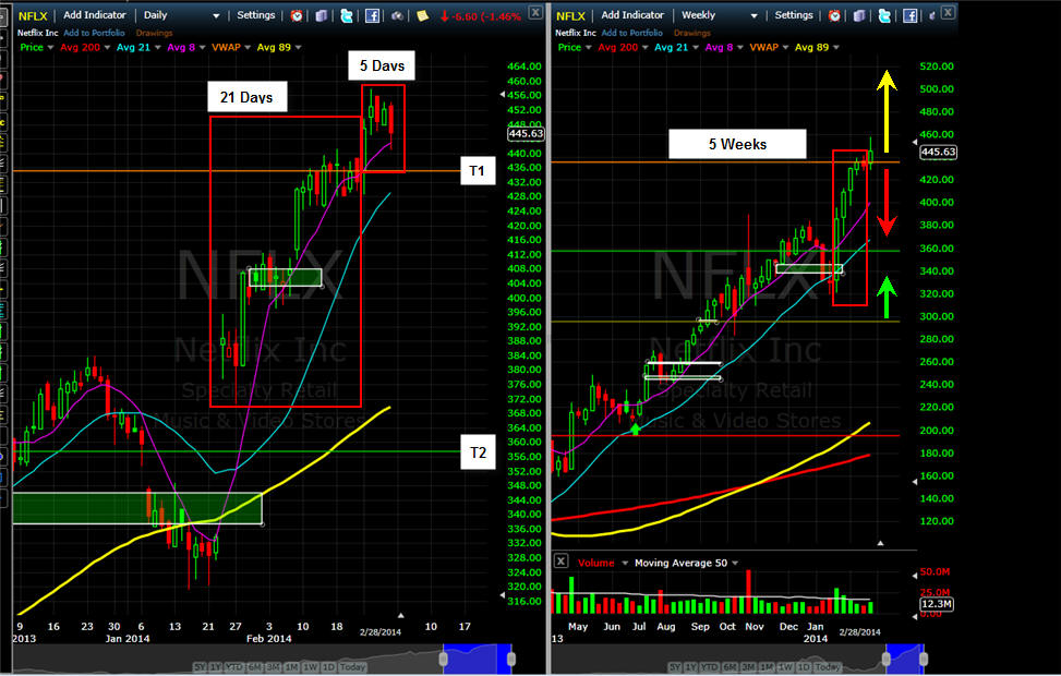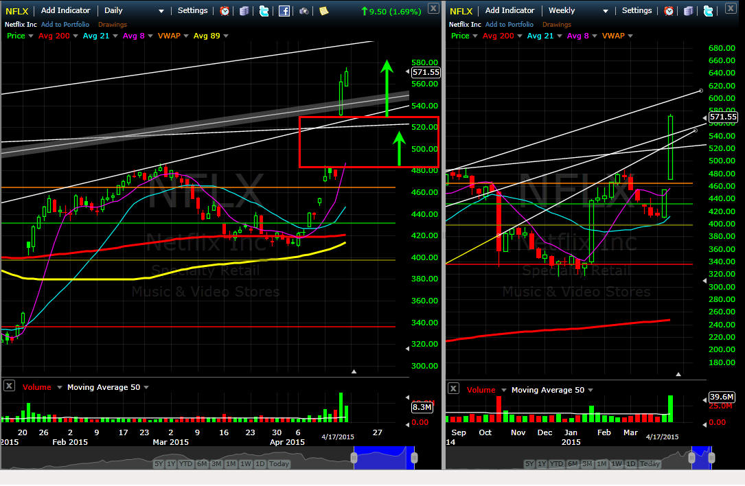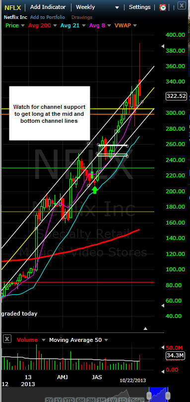 The weekly chart below shows us NFLX has gone parabolic. Upside is unpredictable but when the downside kicks in, we need to be ready with OTM puts. The key to our exit is where the stock can find support. That for me is the 20MA on the daily chart so I plan to have my puts above that moving average to assure I have the best odds of being ITM.