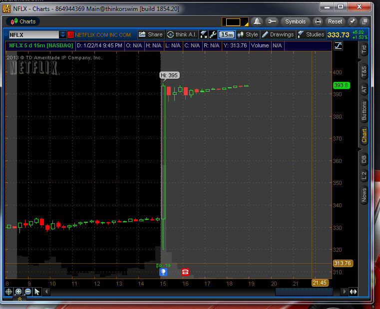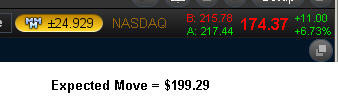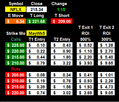 So far pre-market open is indicating NFLX may sell off. If it does, I am looking to get the $220 or $215's as cheap as I can for a potential rally into the rest of the week. 6:21 AM - NFLX is holding price so far. I am looking for a move higher that fails so I can buy the 210 Puts or a move lower to $200 that hold and I can buy the 220 Calls. Not looking like I will get cheap pricing so I will have to adjust my contract size down quite a bit. ============================================================================================== 4/22/13 - NFLX beats by a wide margin and the stock LAUNCHED!!! If current post market prices hold up, we will have another massive WINNER!!! Now that earnings were a blow out and NLFX went well beyond the estimated move of +$24.92, I have cancelled my open orders on the 195 calls and the 155 puts—I will look for a new entry strikes in the morning once I see how the stock is trading in pre-market. I suspect NFLX will pull back on profit taking tomorrow morning and should fall back to the projected move around $200-$205. I am hoping the stock actually gaps up at the open so I can buy the 210 or 205 puts for less than $0.10 cents with the expectation that NFLX will indeed fall back to around $200 by the end of the week...maybe even lower! If NFLX pulls back in pre-market, then I will be looking at jumping on the $220 calls in anticipation the stock catches a bid and takes off again surpassing the $222 high it made in after hours trading today. We have the rest of the week for NFLX to do this, so the calls could work out to be a very profitable White Whale trade! I will put in my LIMIT orders before the market opens once I see how the stock is trading. DO NOT PUT IN MARKET ORDERS, you will definitley get a bad fill. This is a fishing expedition so use limit orders. You can try and stagger your contracts loads with different prices like I have at .01, .05 .10 with your biggest contract size at the lowest price. We have the entire week for these to work out if we get a fill—DO NOT CHASE YOUR ENTRY. NOTE: DO NOT PUT IN ANY MONEY YOU ARE NOT WILLING TO LOSE AS THESE EXPIRE ON FRIDAY AND WE ARE SPECULATING. I also placed a 205 Butterfly spread and was filled for a $0.17 debit. Tomorrow is AAPL earnings so be sure to check out my current plays for that one too!.