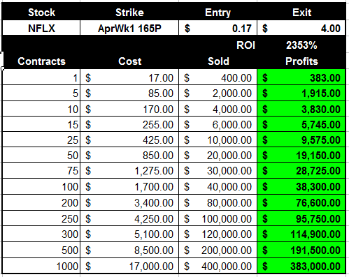 Ok, so what is my plan for NFLX? Same plan I always have, look for cheap Lotto trades and trade around earnings events; however, the current environment in NFLX will most likely not produce those massive multi-thousand percent ROI trades for now, so we just need to concentrate on vertical spread type strategies to finance our lotto trades.