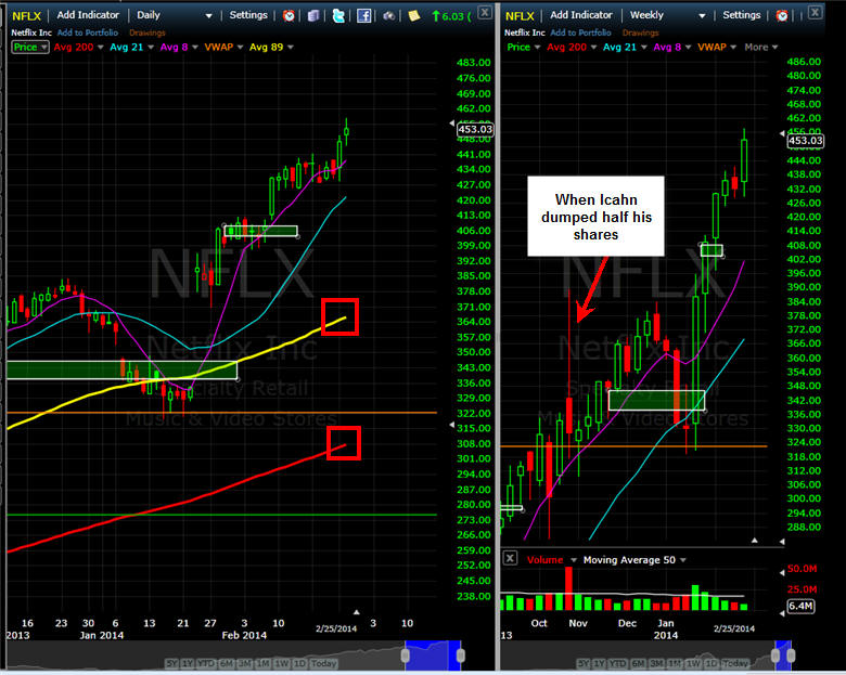 Typically a stock will run up into a split, but figuring out weather NFLX will do it in light of Icahn dumping his shares will only be known after the fact; however, we are speculators and only trade "what is" every day and NFLX can still give us a TON of profits on either side of the action. As for the Icahn exit, will it really have a major impact? Hardly! In in my opinion, his departure has already been played out and we just need to focus on price movement and Lotto trades because NFLX as the split approaches.