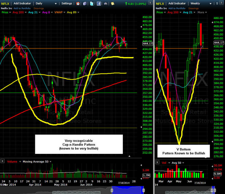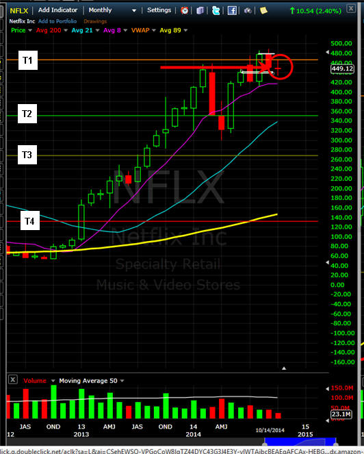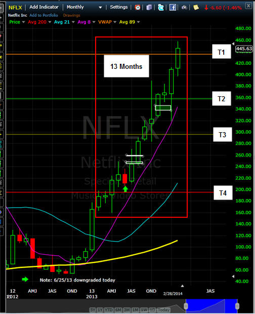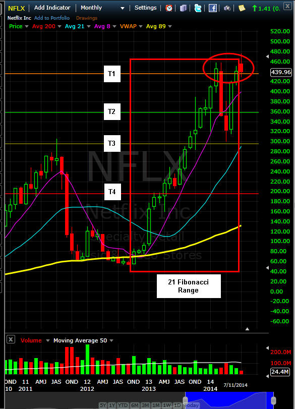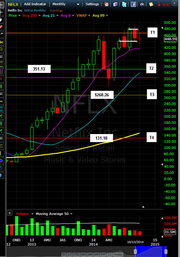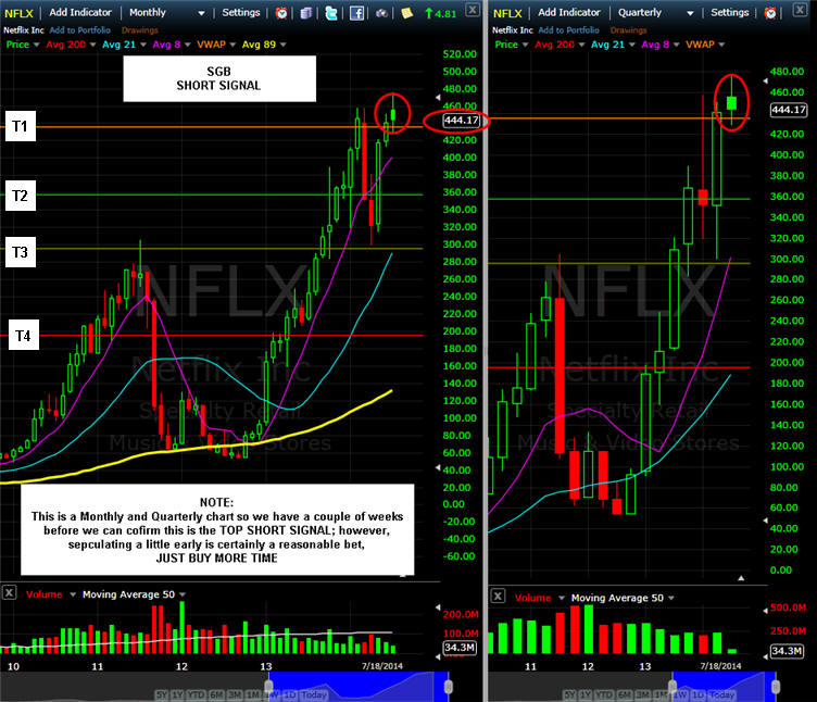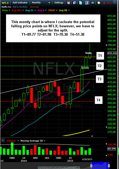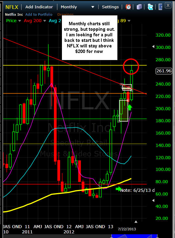 When a stock is going through a split cycle, I like to look at monthly charts to see what impact a split may have on price; and with NFLX having detractors and high profile profit takers; we have to try and figure out the best possible BUY points—even though they are taking profits, it does not mean the stock is going to die, it's just going to adjust it trade price so it's perceived a a cheap value investment in the future. Think about it, if you bought in at $60 like Icahn did and rode it to these heights, wouldn't you be taking profits too?—this is a normal timing of events and should be expected.