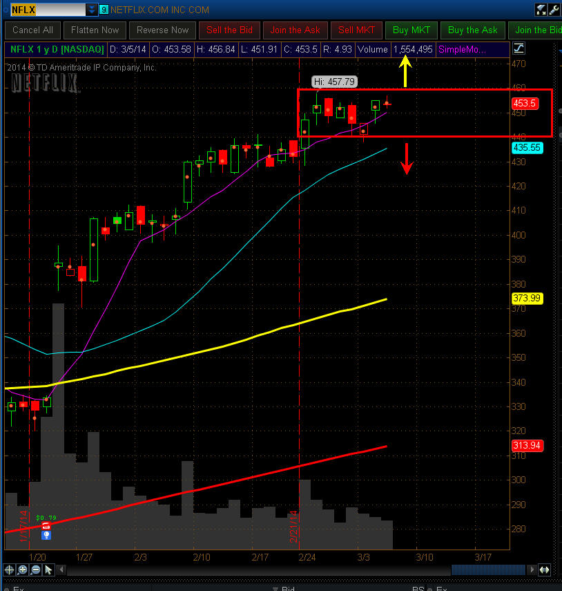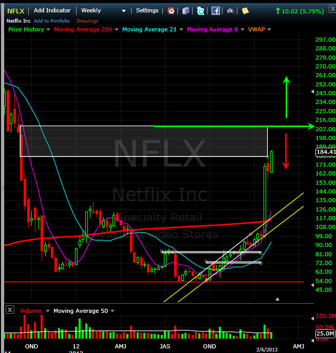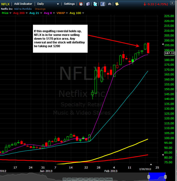 =================================================================== 2/3/13 - NFLX is looking pretty tired for the time being and should be in for some profit taking. I know that is on the minds of so may, especially all of those investors where were massively whacked from the short covering rally of the century. This stock made you a boat load of money if you had those $125.00 lotto calls last week and if not, you are just sick that you did not get in on that massive winning trade. A REAL WHITE WHALE TRADE!!
