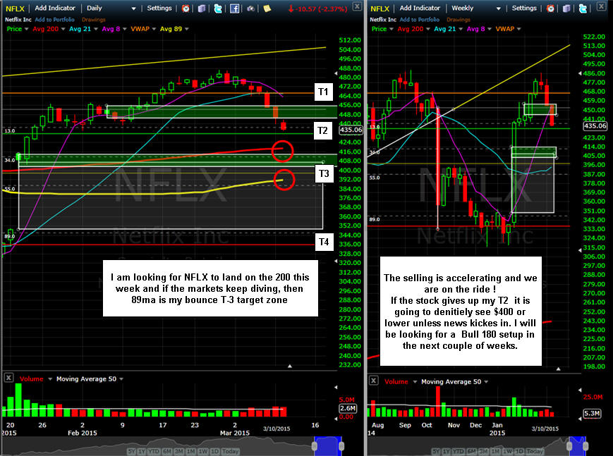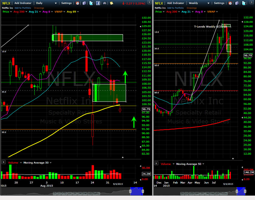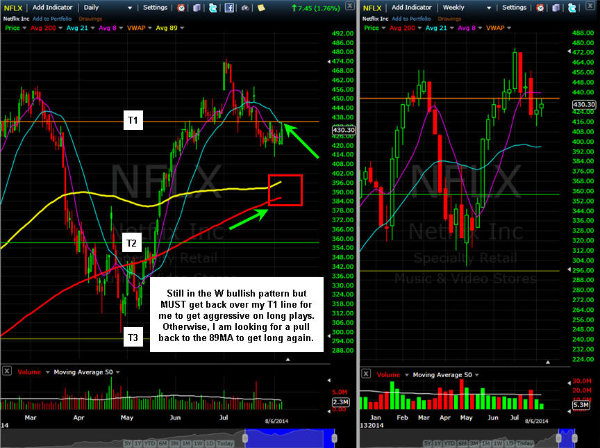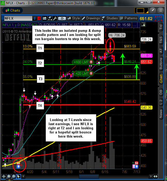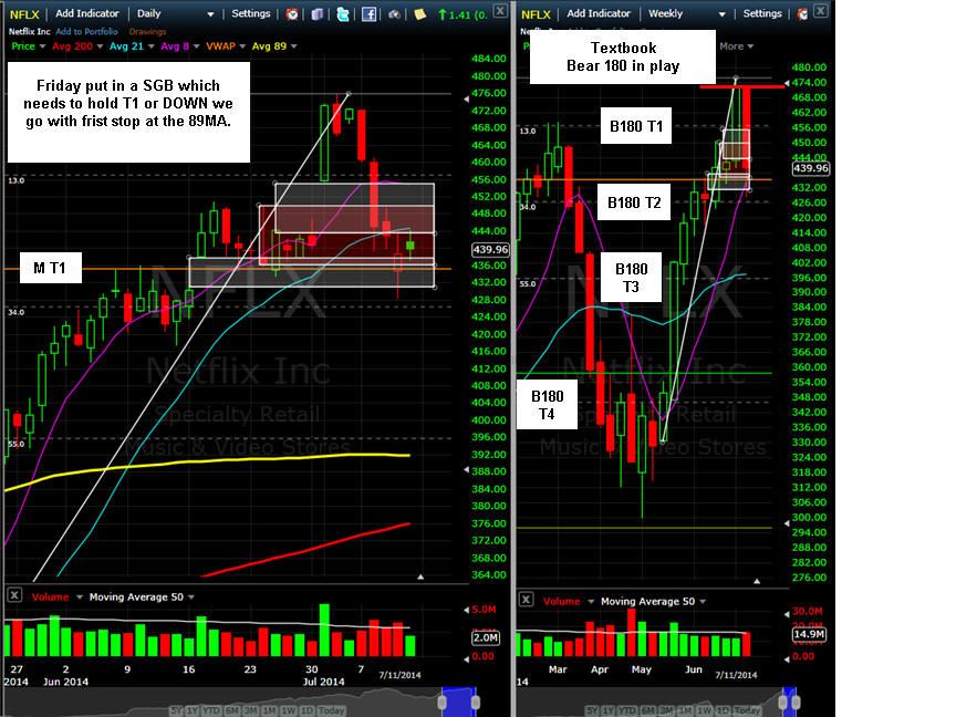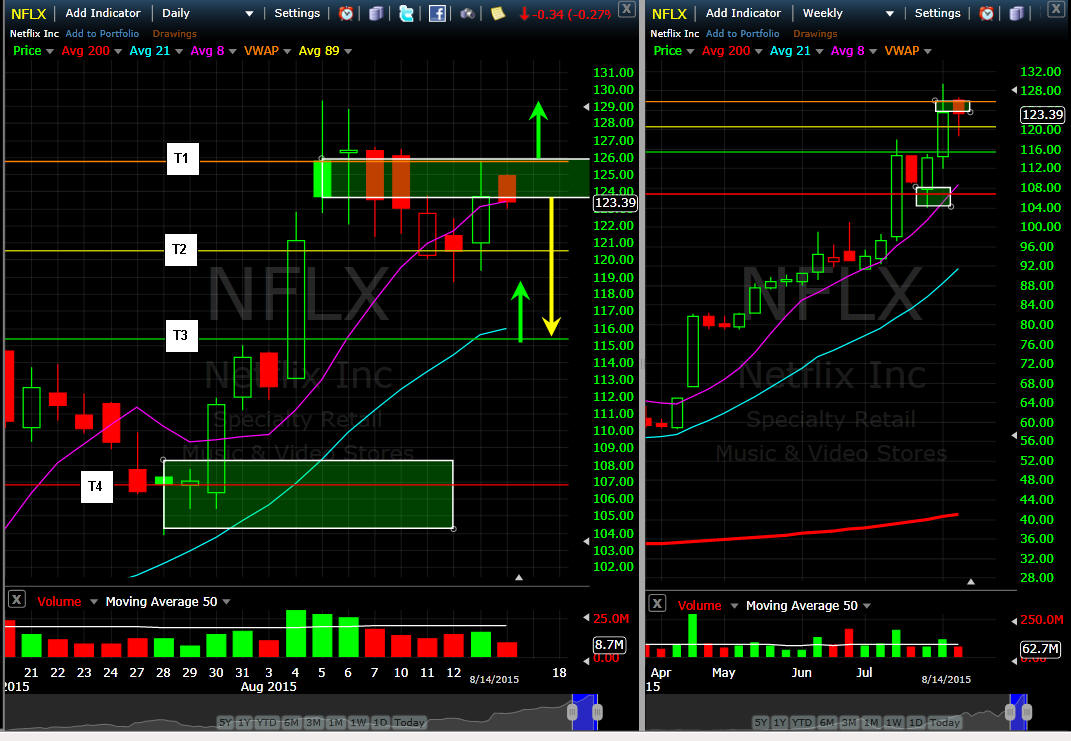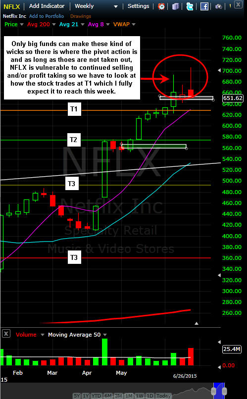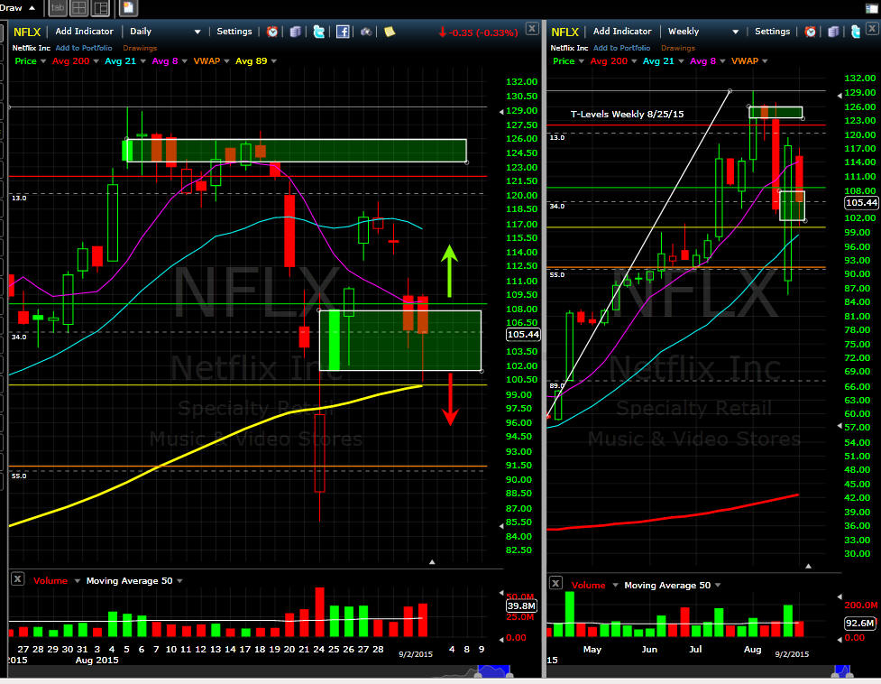 8/17/15 - No big news last week after the slight rally and NFLX fails to take out the SGB so if we get a move under it, I am shorting for only a day trade but keeping lotto calls in play at all times. Downside target is T2 and maybe T3, but that is where I would be a buyer.