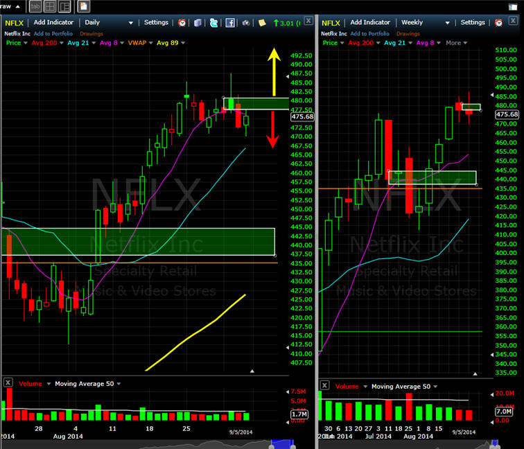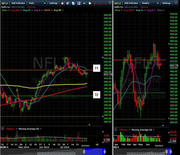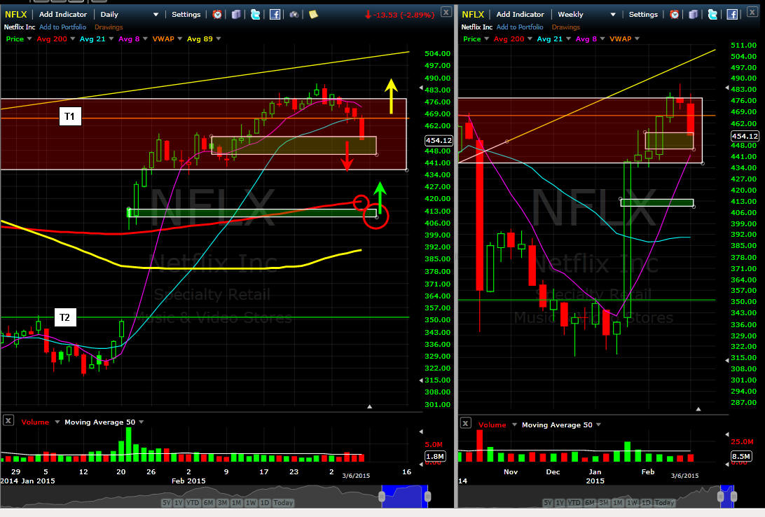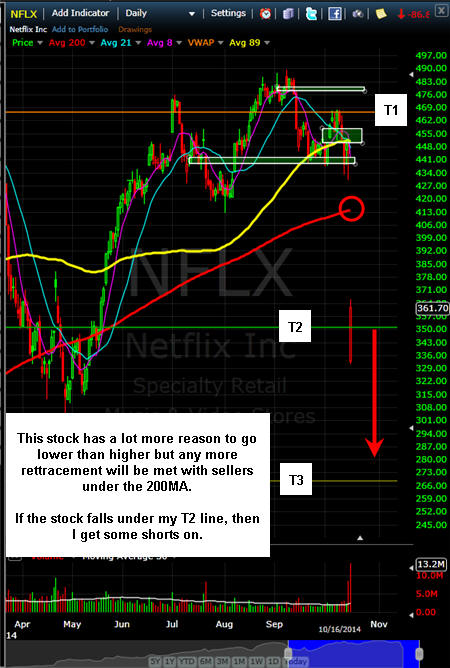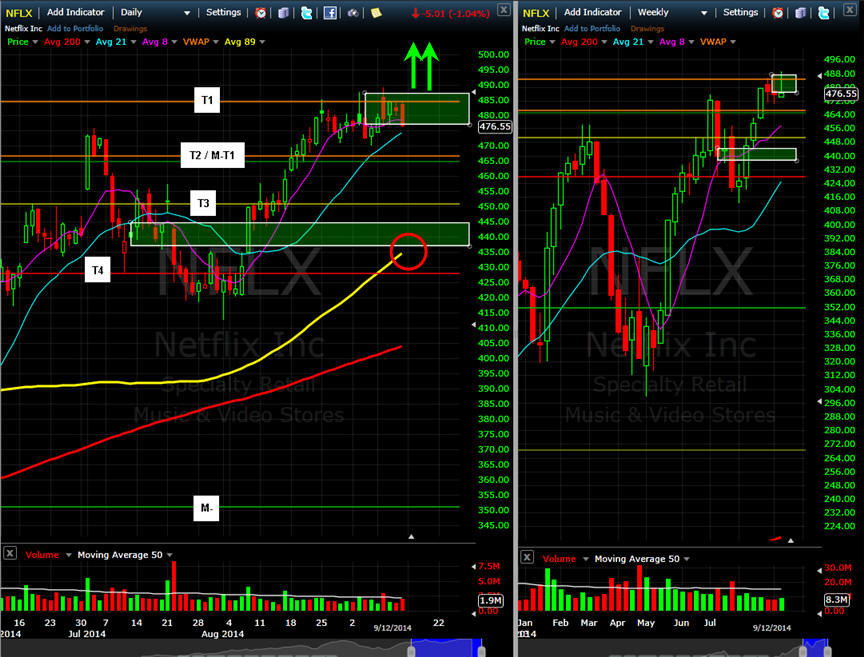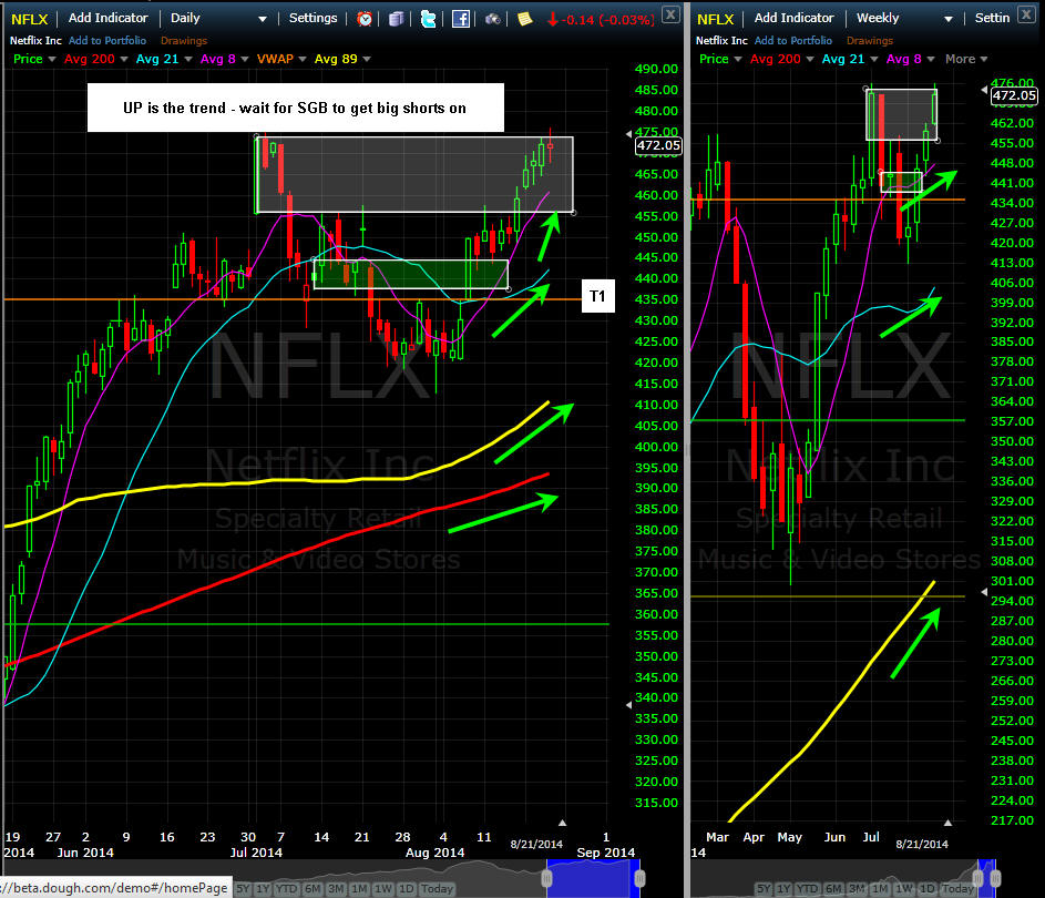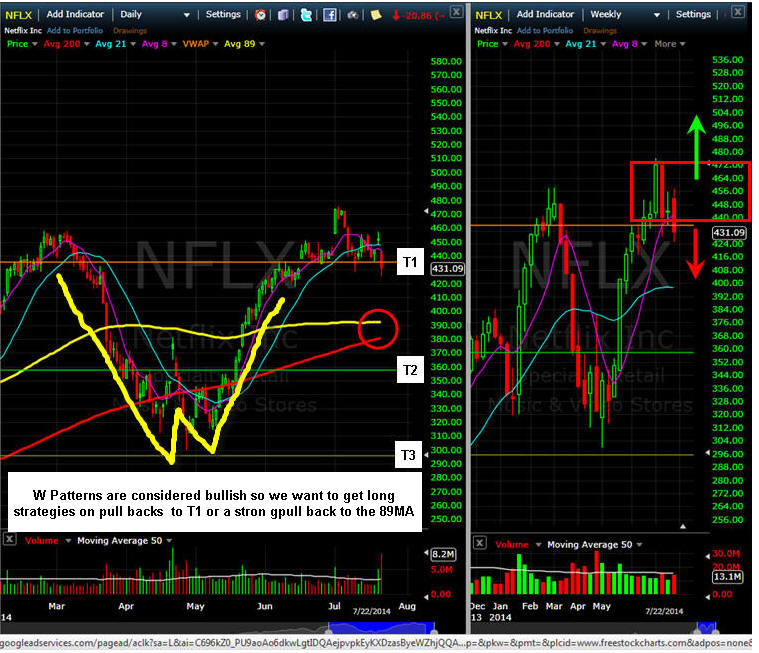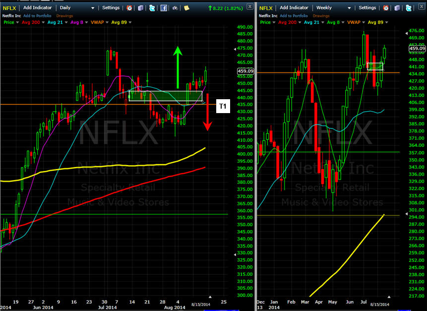 8/17/15 - No big news last week after the slight rally and NFLX fails to take out the SGB so if we get a move under it, I am shorting for only a day trade but keeping lotto calls in play at all times. Downside target is T2 and maybe T3, but that is where I would be a buyer.