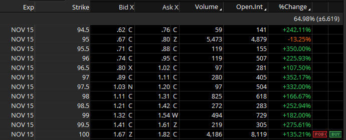 I am placing my order one strike under and above the total move. $95 calls 5 at .15 20 at .05 100 at .01