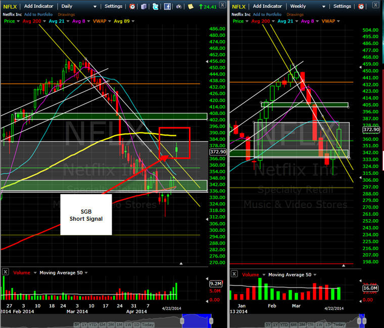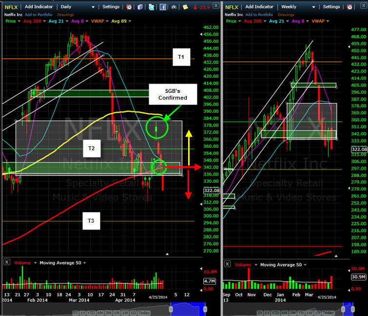 ================================================================================== 4/21/13 - Tomorrow is NFLX earnings and I expect a large move off the news. If they miss, it could be a huge drop! So far, those two SGB I have been talking about have proven to be sell signals. The past three weeks of trading NFLX has consistently sold off indicating a lot of big money investors headed for the door. Get ready for a potential roller coaster rise with this one on Tuesday!. I will also be putting in my White Whale trades in the last half our of trading tomorrow so I will do my best to update you with my actual strike prices and hope we get some fills.