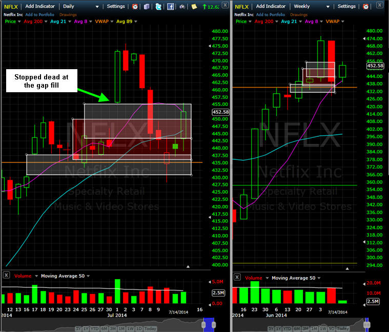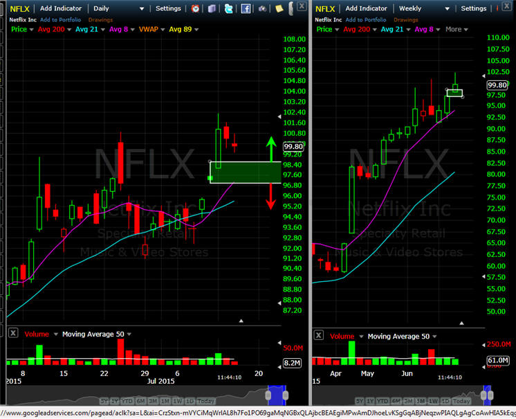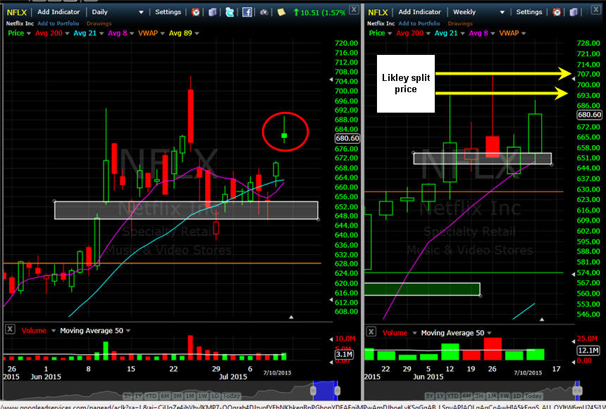 7/11/15 - After a quiet week of trading, NFLX investors jumped in on Friday with a nice gap up; however, it was quickly met with sellers and turned into a DOJI SGB. I do not think that SGB is by any means a short signal at this time, I just wanted to point it out to you. Ok, so how can we play the split? Well, they are splitting the stock on the 14th and on the 15th they report earnings. Hmmm, this is a bit out of the ordinary for a company to split first then report the very next day. In fact, I can't recall ever having this happen and I have been trading for over 17 years. So, why do you think they would be doing it? I mean, it seems obvious to me they plan to BEAT and SURPRISE because it would look really stupid for them to do this unorthodox move and disappoint right? The last big split event was AAPL and that turned out to be total DUD at first, so maybe NFLX will show the trading world how it is done...lol.