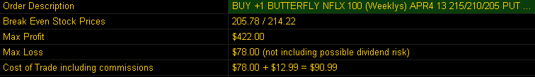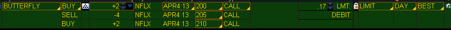 =========================================================================================== 4/25/13 - NFLX is looking ready to start a profit taking dip and I hope it gets to $205 tomorrow or takes out $200 making me profits on both my Butterfly and Puts. If NFLX moves higher in the morning, I will fish for some $205 puts and see if I can catch another White Whale trade. Here is what the 205 options closed at