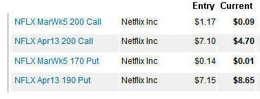 ================================================================================== 4/1/13 - OUCH! NFLX was whacked today :-( I suspected there was a big time seller and if it turns out to be Icahn, this stock will drop as fast as it went up. I have the 190 Naked Puts that are now at risk of being put to me at any time. I will take assignment of the shares if that happens and sell a covered call upon assignment. If they do not get put to me by expiration, then I will roll out to the next month and collect more premium. I jumped on some APRWk1 165 Puts just in case this selling event turns into a melt down. In the meantime, I will be looking for a day trade or two; and if NFLX sells off again tomorrow, I will sell some Bear Call Spreads and collect some more premium. It's looking like my Apr 200 calls are going to expire worthless for now, but I paid for them with the premium I took in on the Naked Puts—I may pick up some $190's if NFLX holds $170.00 I suspect the rumor of a buyout is off the table (unless maybe AAPL buys them...lol) and the selling will now continue up to a 12% drop. The only thing that will propel this stock over $200 is another earnings blowout; and we will not know about that until 4/22/13. Last night on Mad Money, Cramer was very bullish on this stock saying its a good buy based on future compelling news; and still touts the best outcome for this stock would be a buyout from AAPL or MSFT.