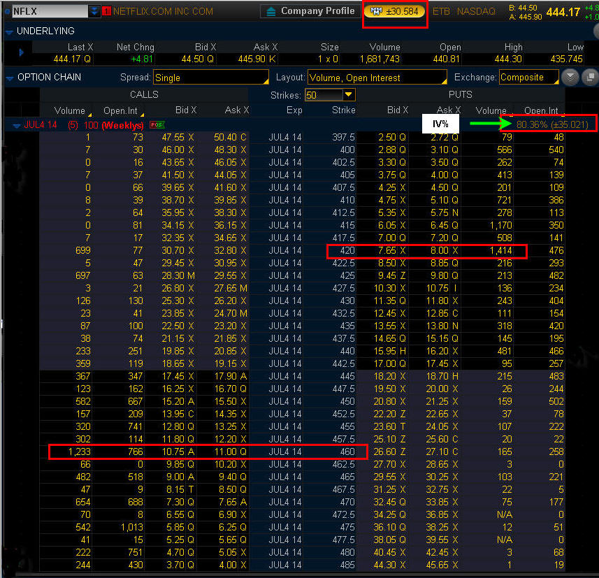 The range to beat is $220 - $244 and that makes it difficult for options plays because there is plenty of premium packed in if you are a buyer. My play is to speculate outside the range because once NFLX makes a move in either direction, then it will be a measured move.