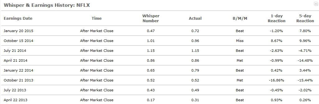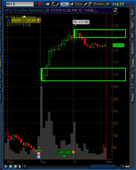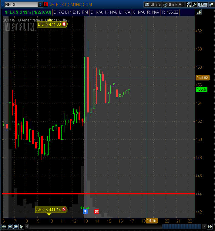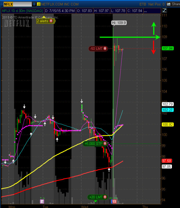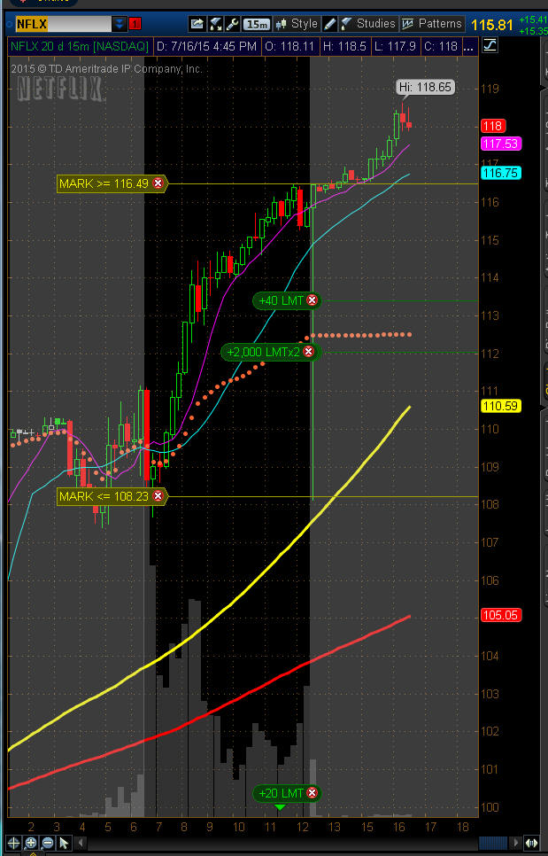 =========================================================================================== 7/15/15 8:30PM - Well they beat estimates, surprised with much better subscriber growth, but costs are rising and NO announcement of China expansion yet. Most likely this huge reaction in post market will resolve to profit taking, but NFLX has historically just kept on driving higher the next day so we have to see. I certainly want to see it put on another $10 tomorrow making the Lotto Calls and BPS a success, but if the stock cannot get over $110 in the first 15 minutes, I will be looking for some short plays into next week's expiration.