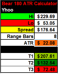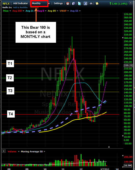 Looking at this monthly chart as a Bear 180 setup, we can get a better idea of the potential pull back if NFLX takes a dive from this stellar rise back to it's previous glory. We are in the 8th month since NLFX found a bottom and that means we still have three weeks for this to fully play out it it does become a Bear 180. The caveat here is this Friday is May options expiration and I suspect the current parabolic move in NFLX will be pushed to it's limits this week. We may even see it blast right past $250 but I think that would take a buyout news story. This has been and will continue to be an exciting and gut wrenching stock to trade so work on your order entry with FISHING prices. You can also sell premium to collect some nice rent too.