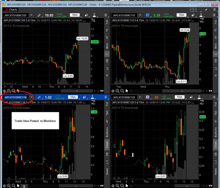 I have the 116 calls listed which are up HUGE today if you were fishing for lower prices like I teach. If NFLX holds after hours pricing, then these will open up strong so be sure to take some profits off if you are in them since they expire tomorrow.