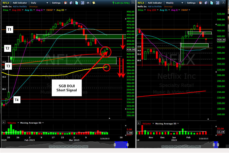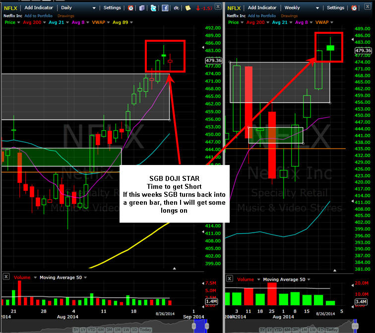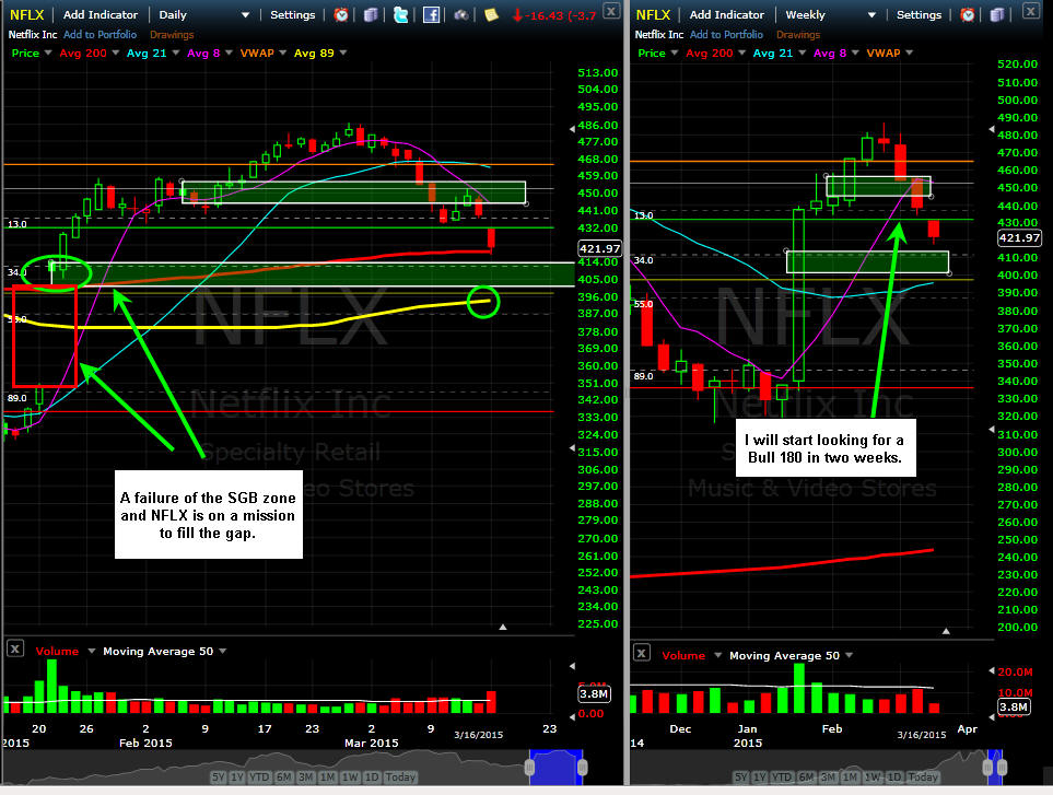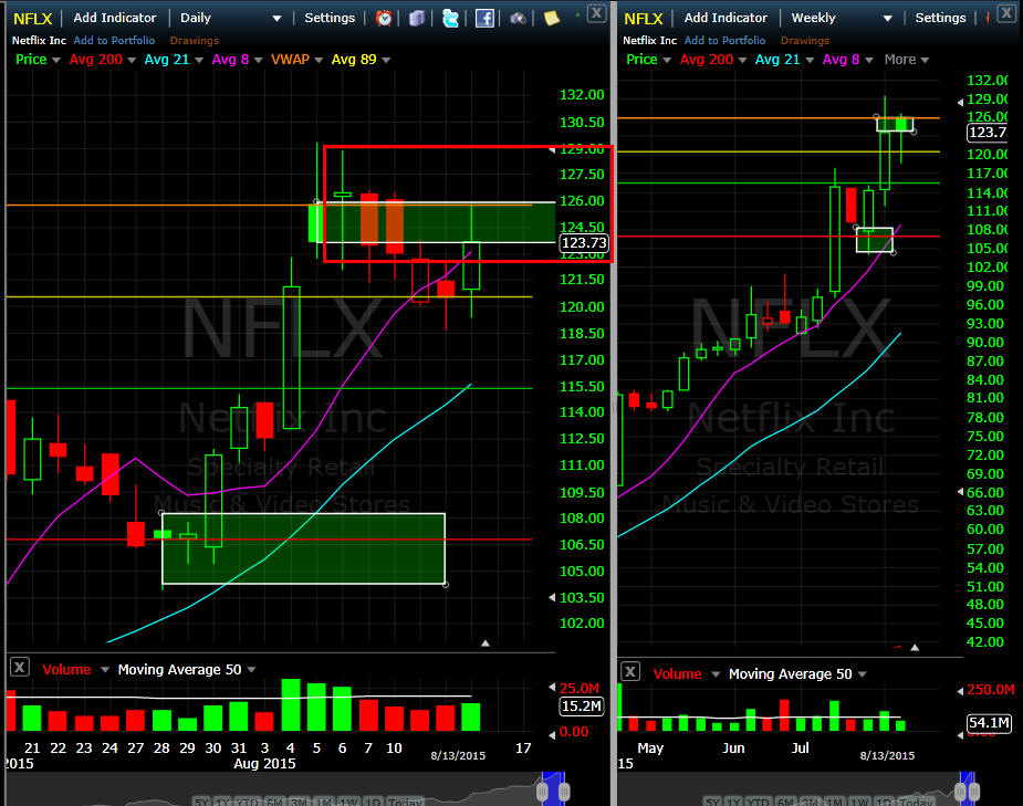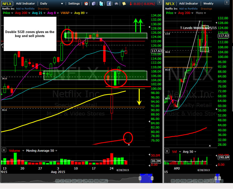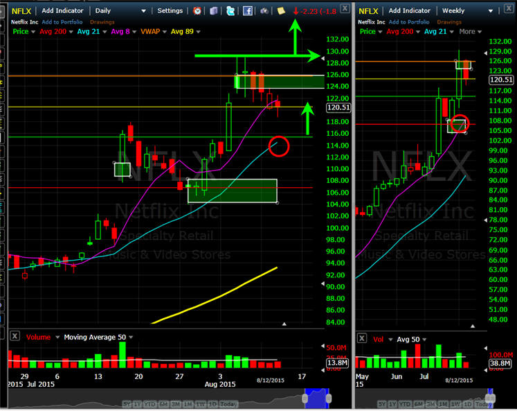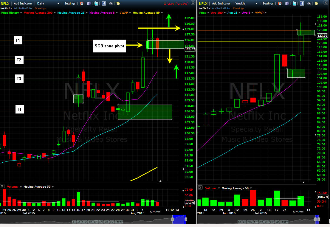 8/19/15 - Today NFLX slipped under the SGB so if you want to short it then stops are at $126.00 but you have to keep some OTM calls going on this stock because it can move quickly on any positive news.