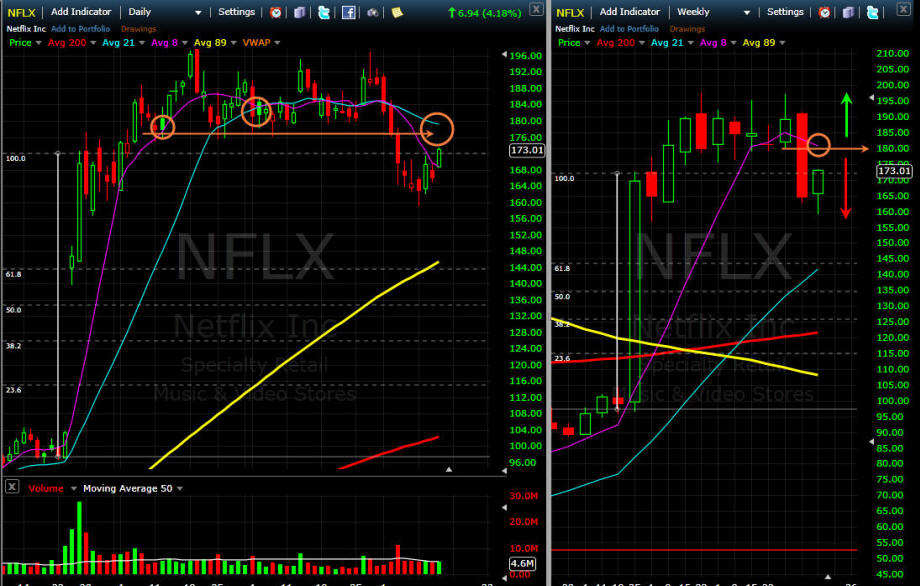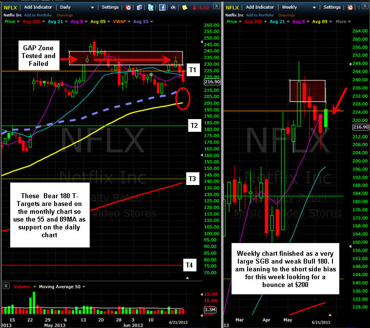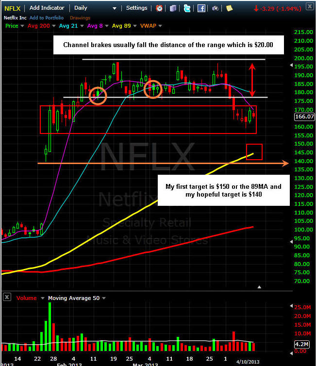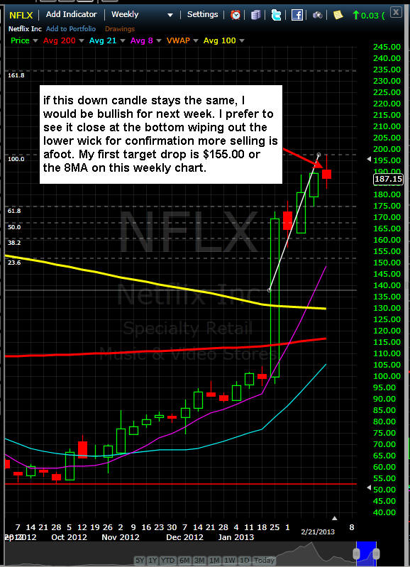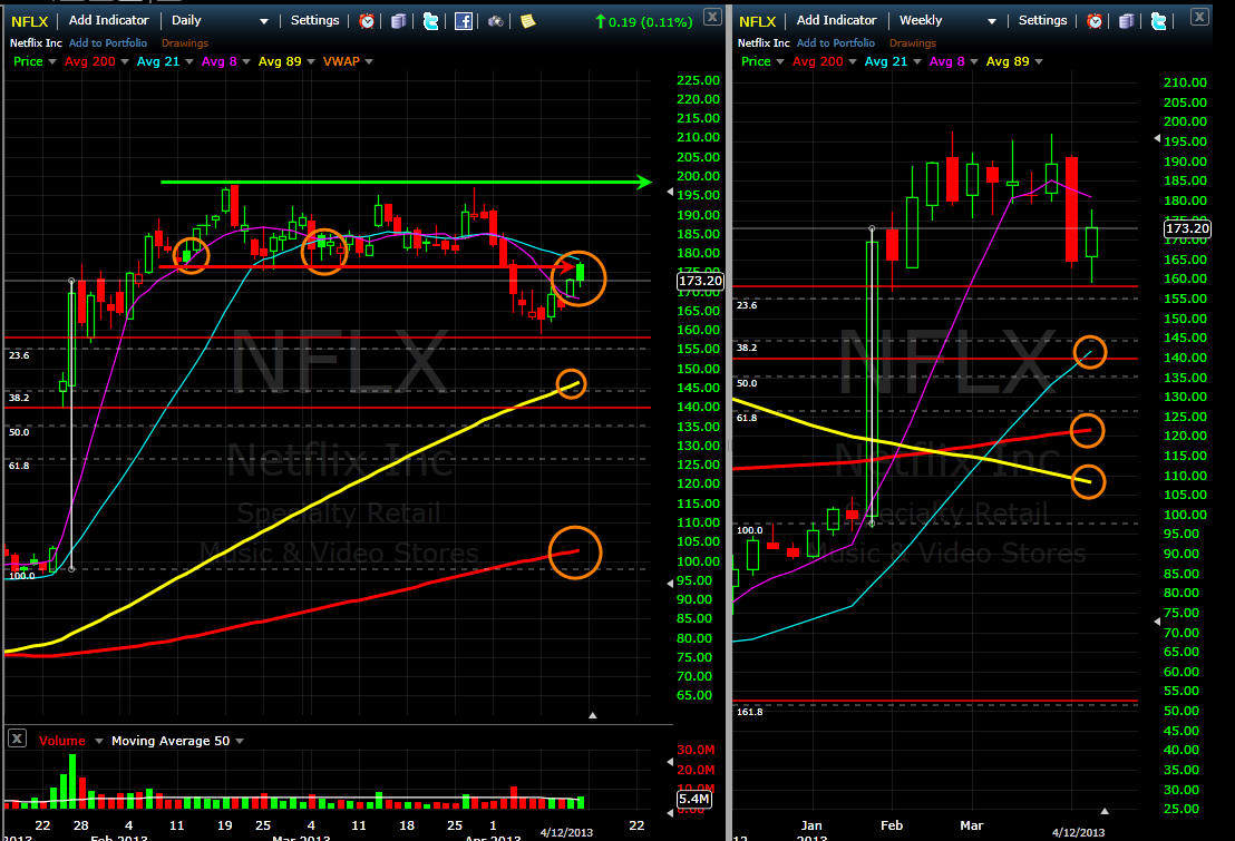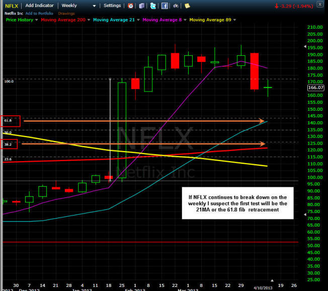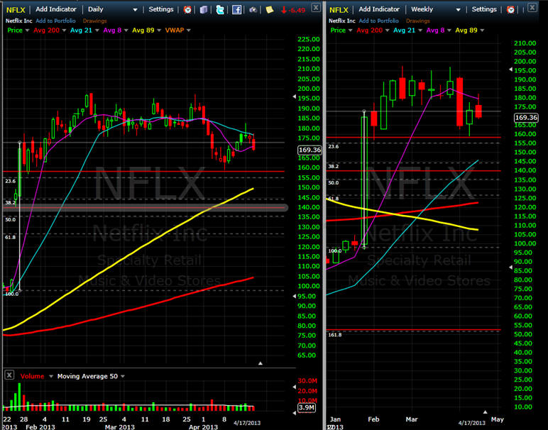 ========================================================================================= 4/8/13 - What an UGLY chart we have on the daily. This stock is looking very damaged and today was the 8th down day. Looking over the charts, we see there is a lot of volatility in the past 4 days based on the large wicks. 4 days ago shows you where the support buyers were waiting just under the 50% Fib retracement (typical) but more importantly is the lack of buyers after that bounce. In fact, Friday's wick shows there was a lot more sellers stepping on the exit gas and today they were were well on their way until the last of the technical bottom feeders jumped on at the 38.2% retracement. If this level does not hold, NFLX is a strong candidate to test the 21MA on the weekly chart and the 89MA on the daily chart. Either way, we are looking at a target of $140 -$145. This stock packs a ton of excitement so if you have the stomach for the swings you stand a chance to make a boat load of loot. For me, I prefer to sell premium and speculate on OTM weekly calls because if they happen to get a buyout offer, the shorts will cover faster than they did last time and this stock will LAUNCH over $200 in 1 - 2 days. The first Bull 180 setup failed, so we have now entered into the 2nd set up with this being the 8th down day in a row. Tomorrow has the potential for a bounce if the markets support it. I am looking to get long stock tomorrow if the stock stays above today's low in pre-market and also opens above today's low. I will keep a strict stop .55 cents below today's low. As for options, I plan on selling put spreads and/or naked puts. I have long 200 calls and I will pick up some 190's. For a lotto trade, I will be buying some $140 puts. I am definitely going to get my naked put shares assigned unless I roll out to the next month which is what I plan to do by the end of this week.