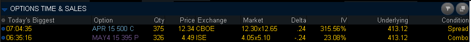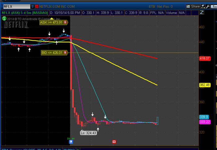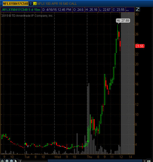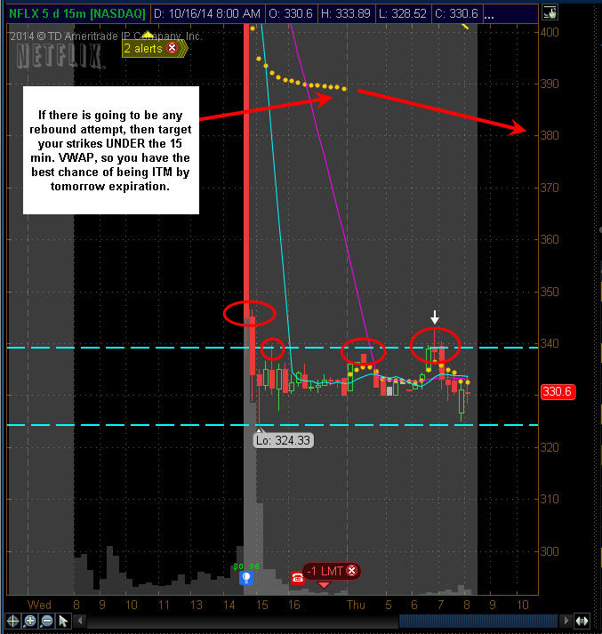 Ok, so now we look at the charts to see that we had a SGB yesterday and today the stock sells off primarily due to comments made on the early morning show Squawk Box with the guests talking about the amazing turn in NFLX and the future of the company. This may have caused some selling pressure on the stock today, but all things said, it looks like NFLX is in for a decent move and unfortunately the option are massively over priced so hard to say if we get a Mega Lotto trade.