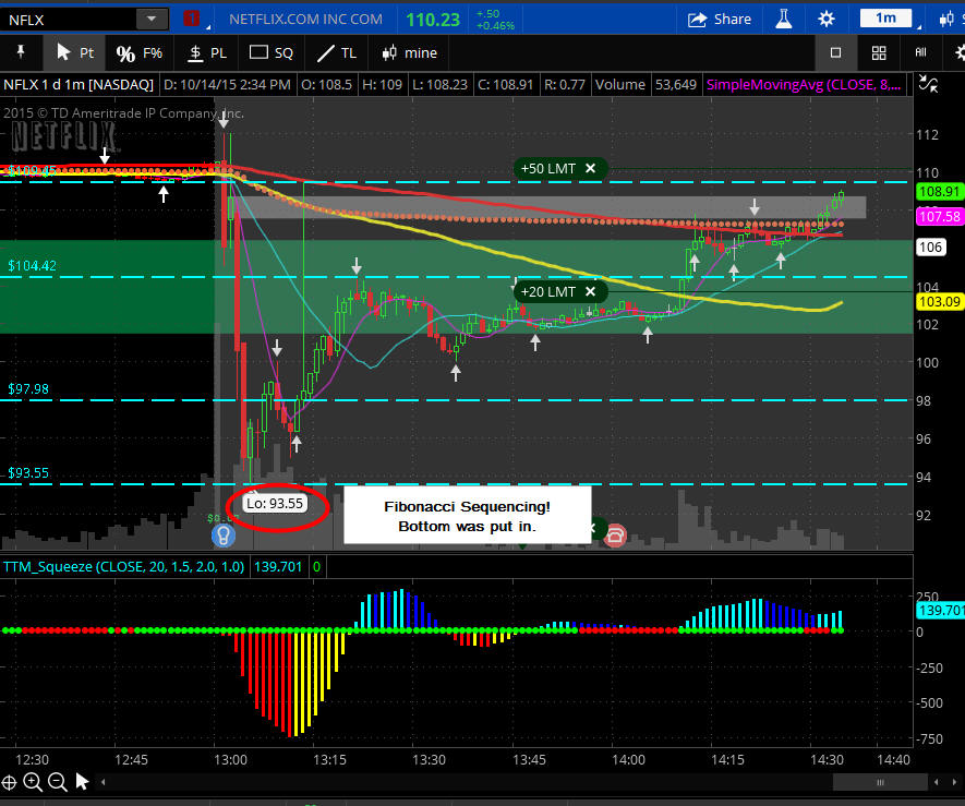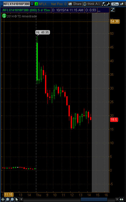 10/14/15 - NFLX missed by $0.01 cent on estimates and lower revenue; however, over seas subscription were stronger and the stock initially was dumped to a bubble low of 93.55 when the buyers stepped on the gas and just drove the stock all the way back in after hours trading. The conference call was excellent and comments on a future deal with AAPL may give us a solid move tomorrow. With that astronomical IV I am sure the MM want to keep a lid on this stock the rest of the week so they can just suck up all that money. We should get a rally good White Whale trade opportunity tomorrow so let's go fishing!